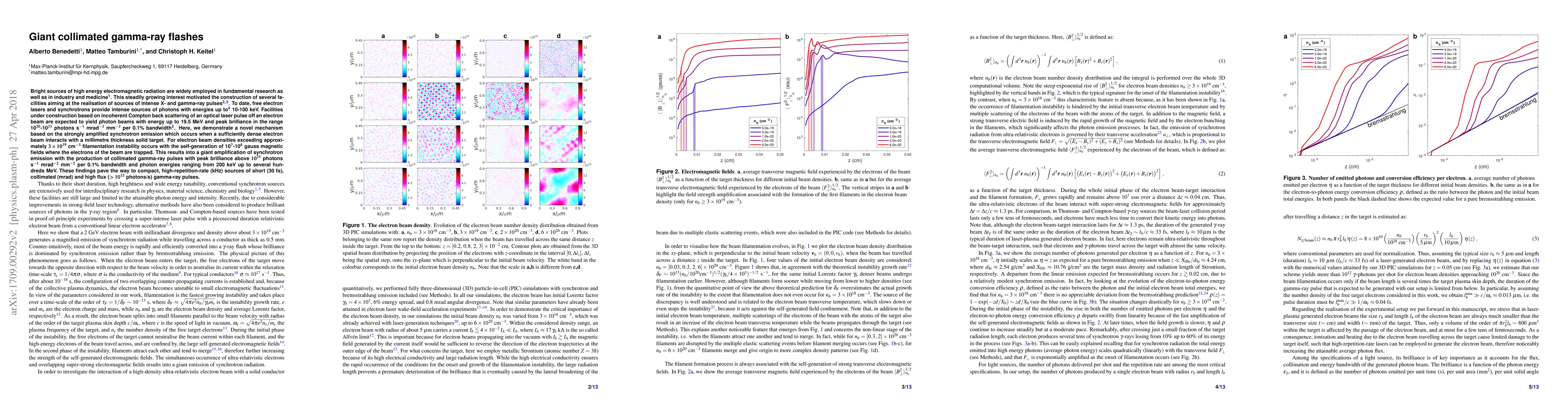 Bright sources of high energy electromagnetic radiation are widely employed in fundamental research as well as in industry and medicine. This steadily growing interest motivated the construction of several facilities aiming at the realisation of sources of intense X- and gamma-ray pulses. To date, free electron lasers and synchrotrons provide intense sources of photons with energies up to 10-100 keV. Facilities under construction based on incoherent Compton back scattering of an optical laser pulse off an electron beam are expected to yield photon beams with energy up to 19.5 MeV and peak brilliance in the range 10$^{20}$-10$^{23}$ photons s$^{-1}$ mrad$^{-2}$ mm$^{-2}$ per 0.1% bandwidth. Here, we demonstrate a novel mechanism based on the strongly amplified synchrotron emission which occurs when a sufficiently dense electron beam interacts with a millimetre thickness solid target. For electron beam densities exceeding approximately $3\times10^{19}\text{ cm$^{-3}$}$ filamentation instability occurs with the self-generation of 10$^{7}$-10$^{8}$ gauss magnetic fields where the electrons of the beam are trapped. This results into a giant amplification of synchrotron emission with the production of collimated gamma-ray pulses with peak brilliance above $10^{25}$ photons s$^{-1}$ mrad$^{-2}$ mm$^{-2}$ per 0.1% bandwidth and photon energies ranging from 200 keV up to several hundreds MeV. These findings pave the way to compact, high-repetition-rate (kHz) sources of short (30 fs), collimated (mrad) and high flux ($>10^{12}$ photons/s) gamma-ray pulses.