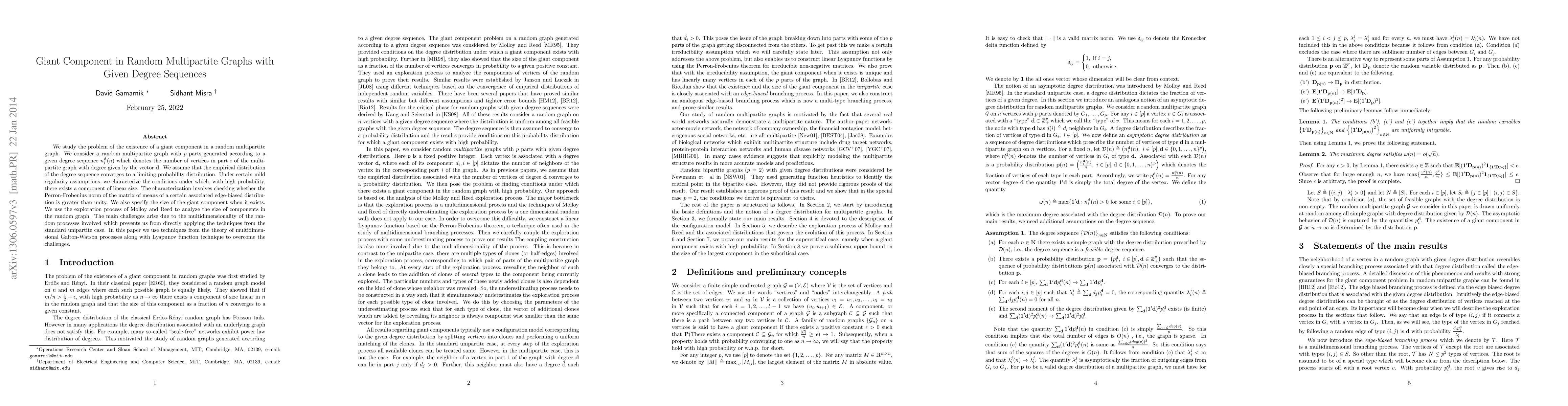 We study the problem of the existence of a giant component in a random multipartite graph. We consider a random multipartite graph with $p$ parts generated according to a given degree sequence $n_i^{\mathbf{d}}(n)$ which denotes the number of vertices in part $i$ of the multipartite graph with degree given by the vector $\mathbf{d}$. We assume that the empirical distribution of the degree sequence converges to a limiting probability distribution. Under certain mild regularity assumptions, we characterize the conditions under which, with high probability, there exists a component of linear size. The characterization involves checking whether the Perron-Frobenius norm of the matrix of means of a certain associated edge-biased distribution is greater than unity. We also specify the size of the giant component when it exists. We use the exploration process of Molloy and Reed combined with techniques from the theory of multidimensional Galton-Watson processes to establish this result.