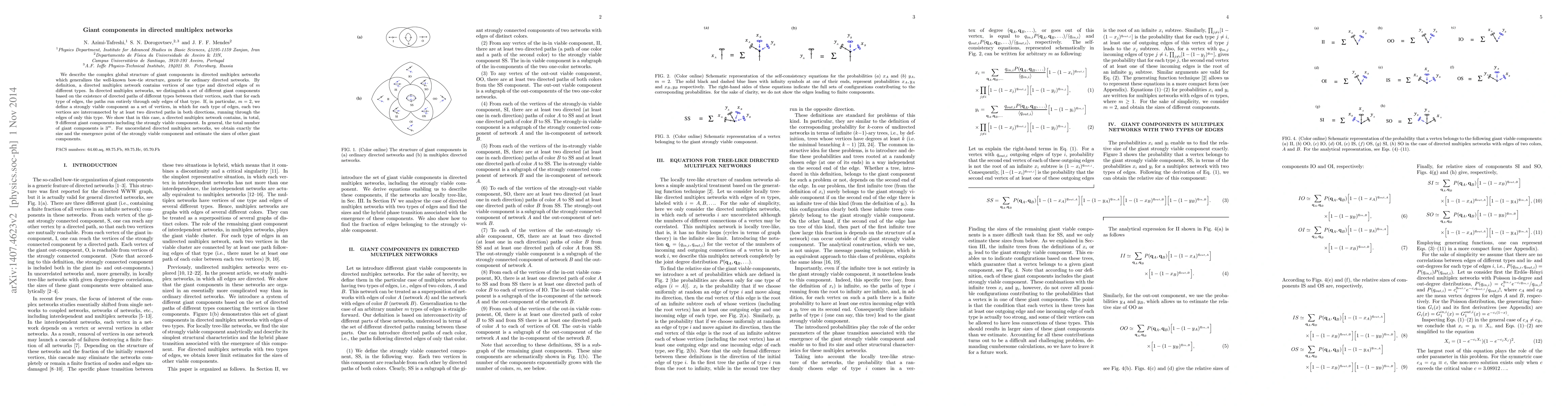 This paper explores the global structure of giant components in directed multiplex networks, identifying $3^m$ distinct giant components based on the types of directed paths. For $m=2$, it introduces strongly viable components, characterized by bidirectional paths of each edge type, and shows that such networks contain nine distinct giant components.