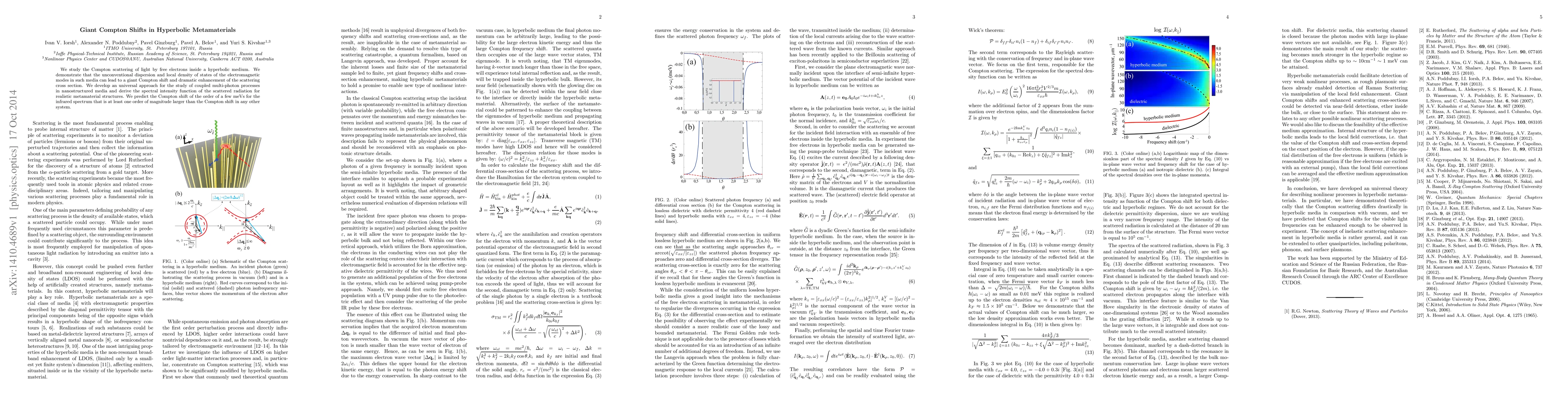 We study the Compton scattering of light by free electrons inside a hyperbolic medium. We demonstrate that the unconventional dispersion and local density of states of the electromagnetic modes in such media can lead to a giant Compton shift and dramatic enhancement of the scattering cross section. We develop an universal approach for the study of coupled multi-photon processes in nanostructured media and derive the spectral intensity function of the scattered radiation for realistic metamaterial structures. We predict the Compton shift of the order of a few meVs for the infrared spectrum that is at least one order of magnitude larger than the Compton shift in any other system.