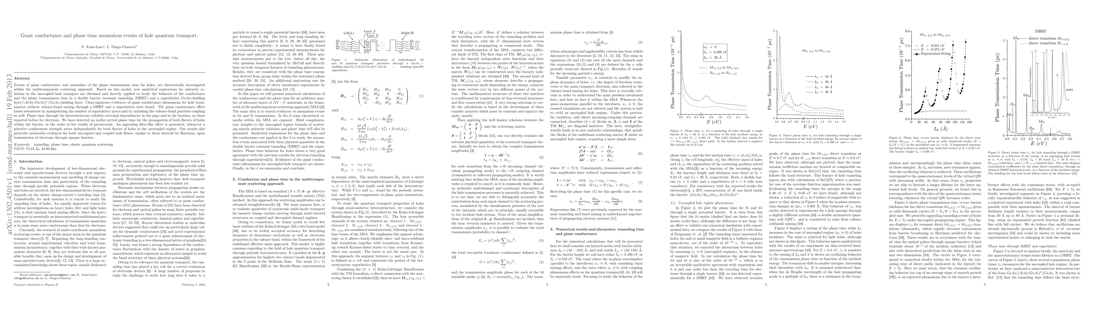 Events of giant conductance and anomalies of the phase transmission time for holes, are theoretically investigated within the multicomponent scattering approach. Based on this model, new analytical expressions for unitarity relations in the uncoupled hole transport are obtained and directly applied to study the behavior of the conductance and the phase transmission time in a double barrier resonant tunneling (DBRT) and a superlattice $GaAs$-cladding layer$/(AlAs/GaAs)^{n}/GaAs$-cladding layer. Clear-signature evidences of giant conductance phenomena for hole transmission without valence-band mixing through a DBRT and a superlattice were found. The giant conductance effect losses robustness by manipulating the number of superlattice layers and by including the valence-band particles coupling as well. Phase time through the heterostructure exhibits extremal dependencies in the gaps and in the barriers, as those reported before for electrons. We have detected an earlier arrival phase time for the propagation of both flavors of holes within the barrier, in the order of few tenths of picoseconds. An appealing filter-like effect is presented, whenever a selective confinement strength arises independently for both flavors of holes in the uncoupled regime. Our results also prescribe noticeable evidences for both uncoupled and coupled hole fluxes, similar to those foretold by Hartman, upon transmission of electrons through opaque barriers.