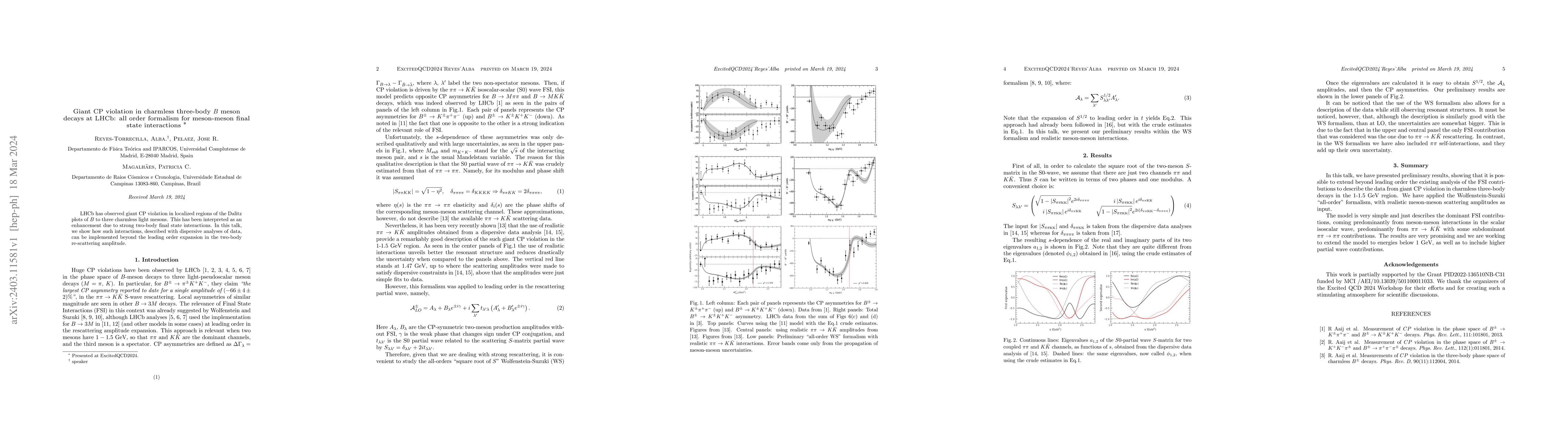 LHCb has observed giant CP violation in localized regions of the Dalitz plots of B to three charmless light mesons. This has been interpreted as an enhancement due to strong two-body final state interactions. In this talk, we show how such interactions, described with dispersive analyses of data, can be implemented beyond the leading order expansion in the two-body re-scattering amplitude.