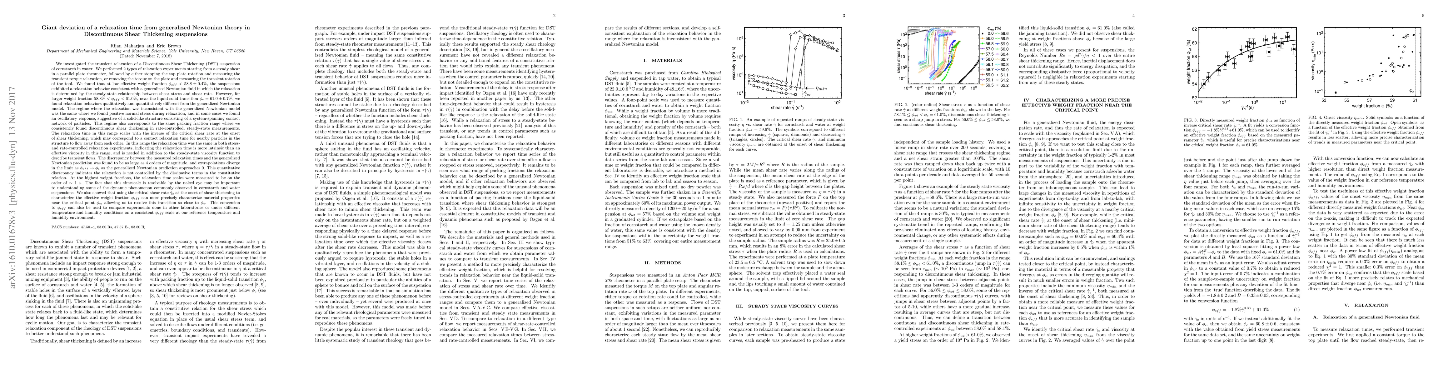 This study investigates the transient relaxation behavior of discontinuous shear thickening cornstarch-water suspensions, revealing significant deviations from generalized Newtonian fluid models at weight fractions near the liquid-solid transition. The relaxation time diverges dramatically, up to $10^4$ times, from predictions, highlighting the need for a new characterization method using the critical shear rate.