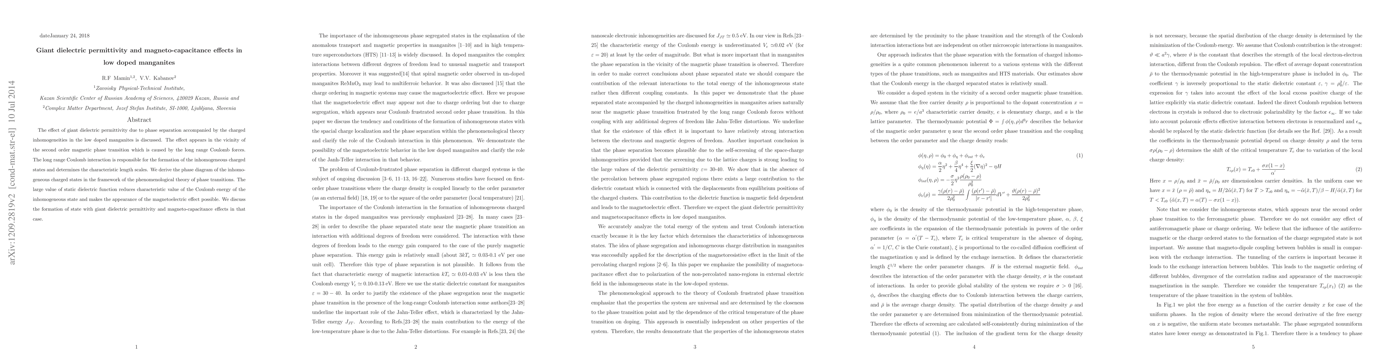 This paper investigates the giant dielectric permittivity and magneto-capacitance in low-doped manganites, attributing these phenomena to phase separation and charged inhomogeneities near a second-order magnetic phase transition driven by long-range Coulomb forces. The study derives a phase diagram for these inhomogeneous charged states and explores the resultant magnetoelectric effect.