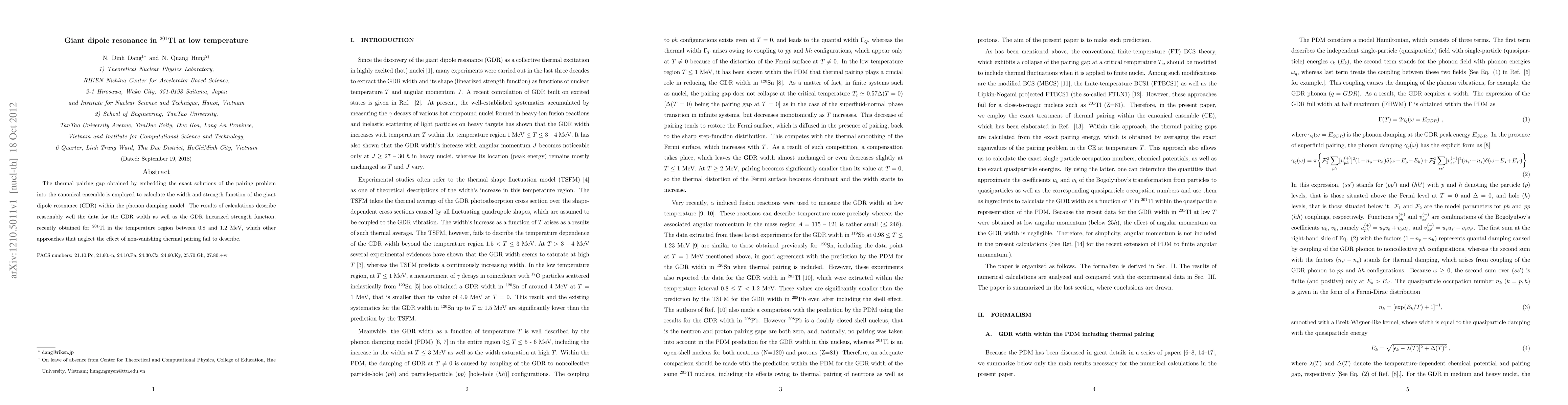 This study calculates the width and strength function of the giant dipole resonance in $^{201}$Tl using the phonon damping model, incorporating thermal pairing effects. The results accurately describe experimental data for the GDR, outperforming methods that ignore thermal pairing.