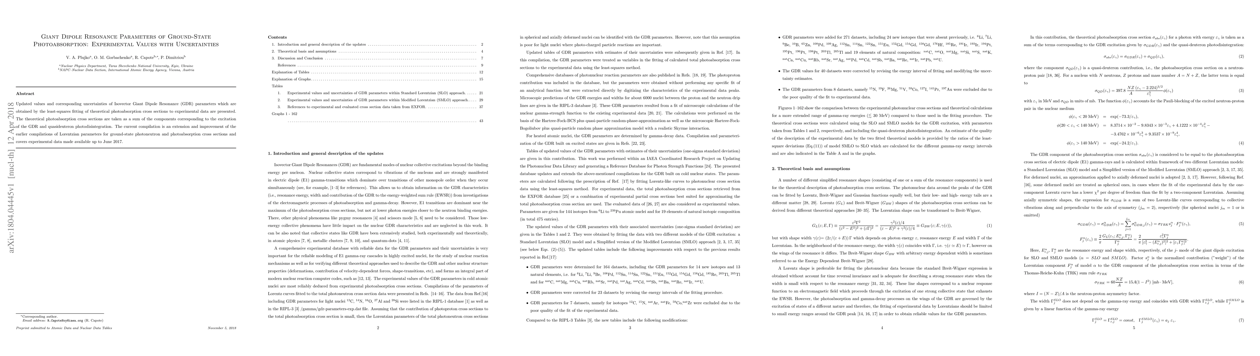 Updated values and corresponding uncertainties of Isovector Giant Dipole Resonance (GDR) parameters which are obtained by the least-squares fitting of theoretical photoabsorption cross sections to experimental data are presented. The theoretical photoabsorption cross sections are taken as a sum of the components corresponding to the excitation of the GDR and quasideuteron photodisintegration. The current compilation is an extension and improvement of the earlier compilations of Lorentzian parameters for ground-state photoneutron and photoabsorption cross sections and covers experimental data made available up to June 2017.