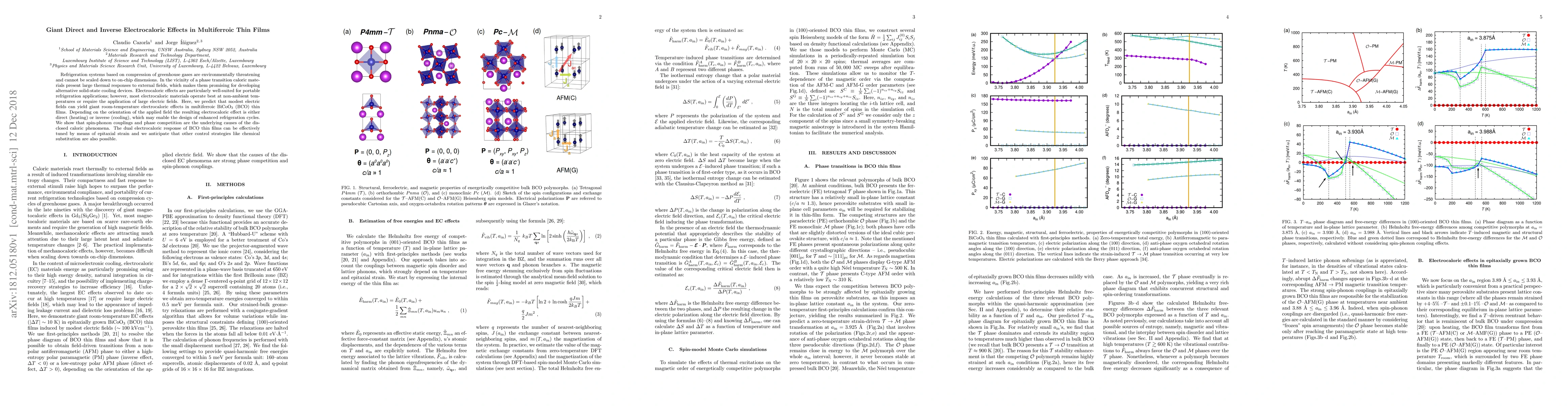 Refrigeration systems based on compression of greenhouse gases are environmentally threatening and cannot be scaled down to on-chip dimensions. In the vicinity of a phase transition caloric materials present large thermal responses to external fields, which makes them promising for developing alternative solid-state cooling devices. Electrocaloric effects are particularly well-suited for portable refrigeration applications; however, most electrocaloric materials operate best at non-ambient temperatures or require the application of large electric fields. Here, we predict that modest electric fields can yield giant room-temperature electrocaloric effects in multiferroic BiCoO$_{3}$ (BCO) thin films. Depending on the orientation of the applied field the resulting electrocaloric effect is either direct (heating) or inverse (cooling), which may enable the design of enhanced refrigeration cycles. We show that spin-phonon couplings and phase competition are the underlying causes of the disclosed caloric phenomena. The dual electrocaloric response of BCO thin films can be effectively tuned by means of epitaxial strain and we anticipate that other control strategies like chemical substitution are also possible.