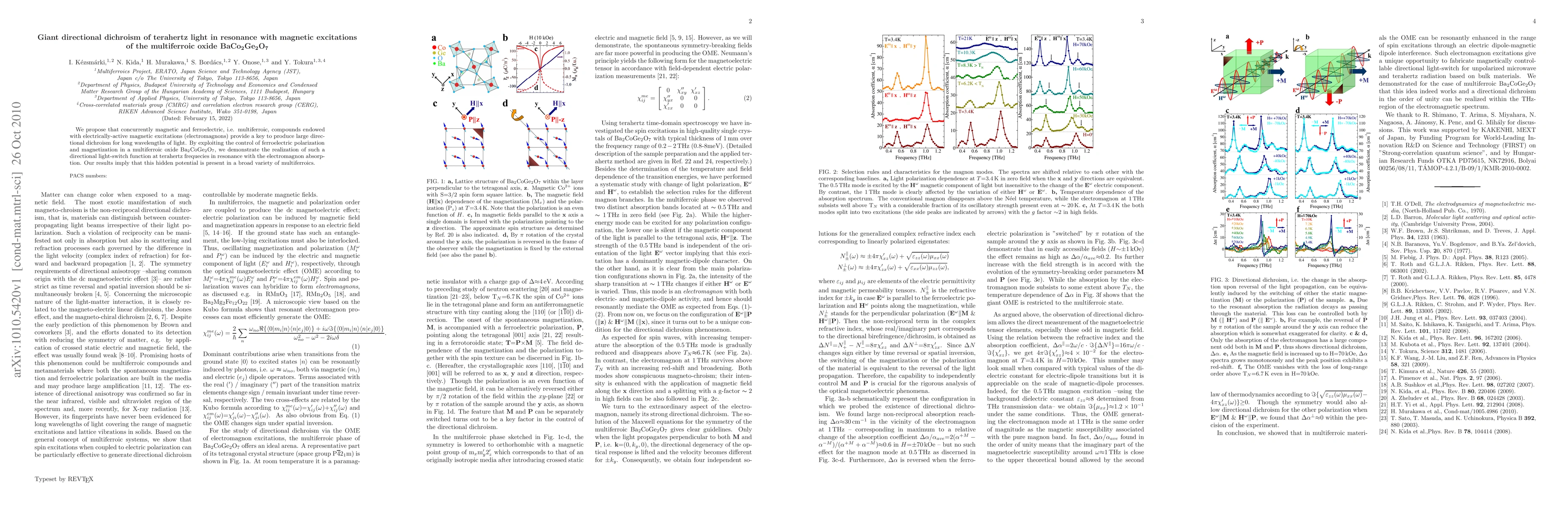 This research demonstrates giant directional dichroism of terahertz light in the multiferroic oxide Ba$_2$CoGe$_2$O$_7$ in resonance with its magnetic excitations. The study reveals that controlling ferroelectric polarization and magnetization in such materials can enable a significant light-switching function at terahertz frequencies.