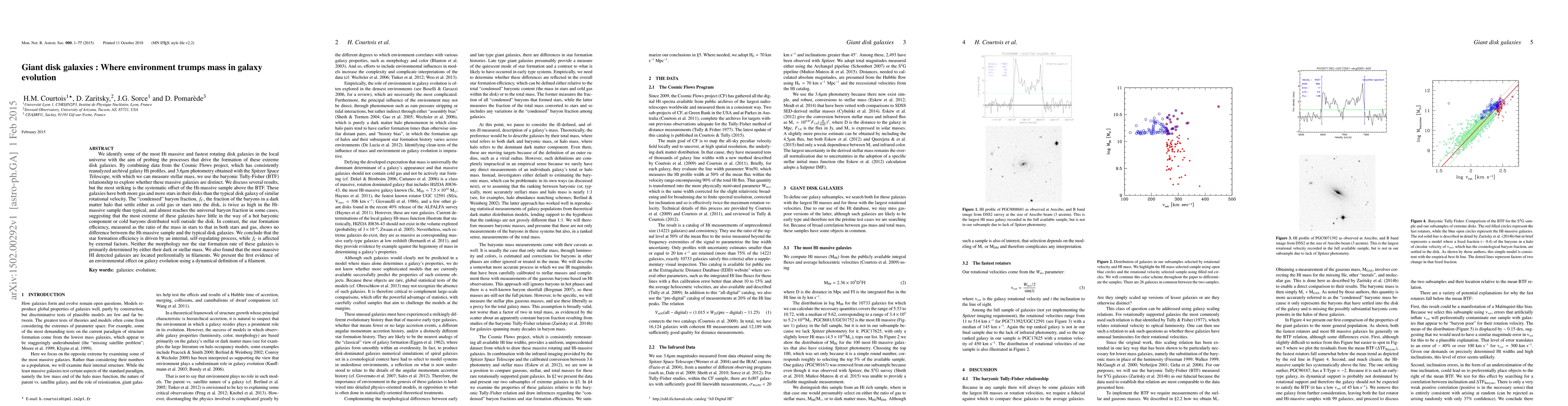 We identify some of the most HI massive and fastest rotating disk galaxies in the local universe with the aim of probing the processes that drive the formation of these extreme disk galaxies. By combining data from the Cosmic Flows project, which has consistently reanalyzed archival galaxy HI profiles, and 3.6$\mu$m photometry obtained with the Spitzer Space Telescope, with which we can measure stellar mass, we use the baryonic Tully-Fisher (BTF) relationship to explore whether these massive galaxies are distinct. We discuss several results, but the most striking is the systematic offset of the HI-massive sample above the BTF. These galaxies have both more gas and more stars in their disks than the typical disk galaxy of similar rotational velocity. The "condensed" baryon fraction, $f_C$, the fraction of the baryons in a dark matter halo that settle either as cold gas or stars into the disk, is twice as high in the HI-massive sample than typical, and almost reaches the universal baryon fraction in some cases, suggesting that the most extreme of these galaxies have little in the way of a hot baryonic component or cold baryons distributed well outside the disk. In contrast, the star formation efficiency, measured as the ratio of the mass in stars to that in both stars and gas, shows no difference between the HI-massive sample and the typical disk galaxies. We conclude that the star formation efficiency is driven by an internal, self-regulating process, while $f_C$ is affected by external factors. We also found that the most massive HI detected galaxies are located preferentially in filaments. We present the first evidence of an environmental effect on galaxy evolution using a dynamical definition of a filament.