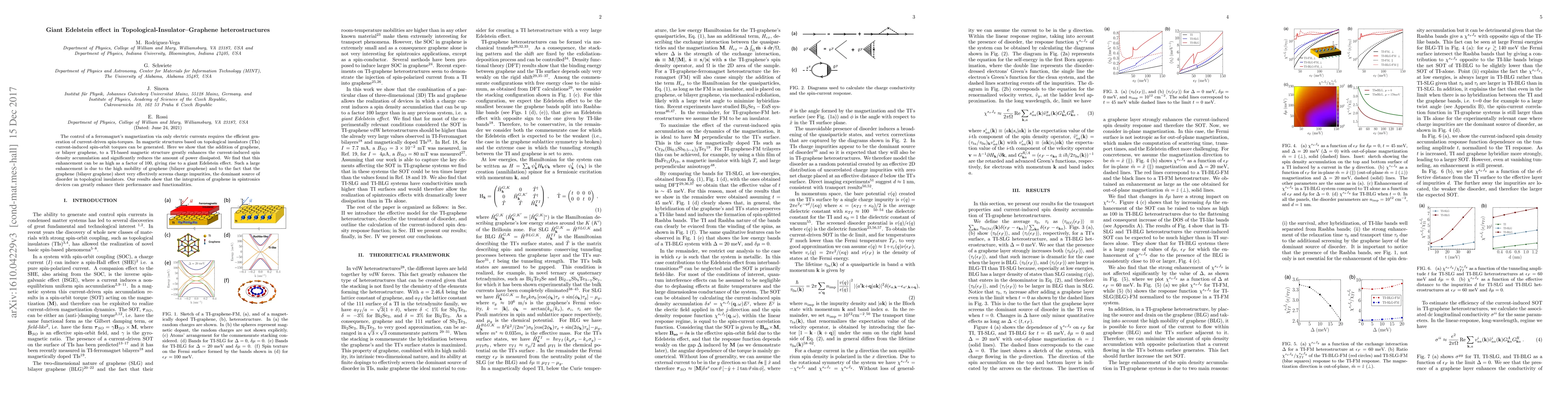 This paper demonstrates a significant enhancement of the Edelstein effect in topological-insulator-graphene heterostructures, achieving up to a 100-fold increase due to graphene's high mobility and effective charge screening, which improves spin-torque efficiency and reduces power dissipation.