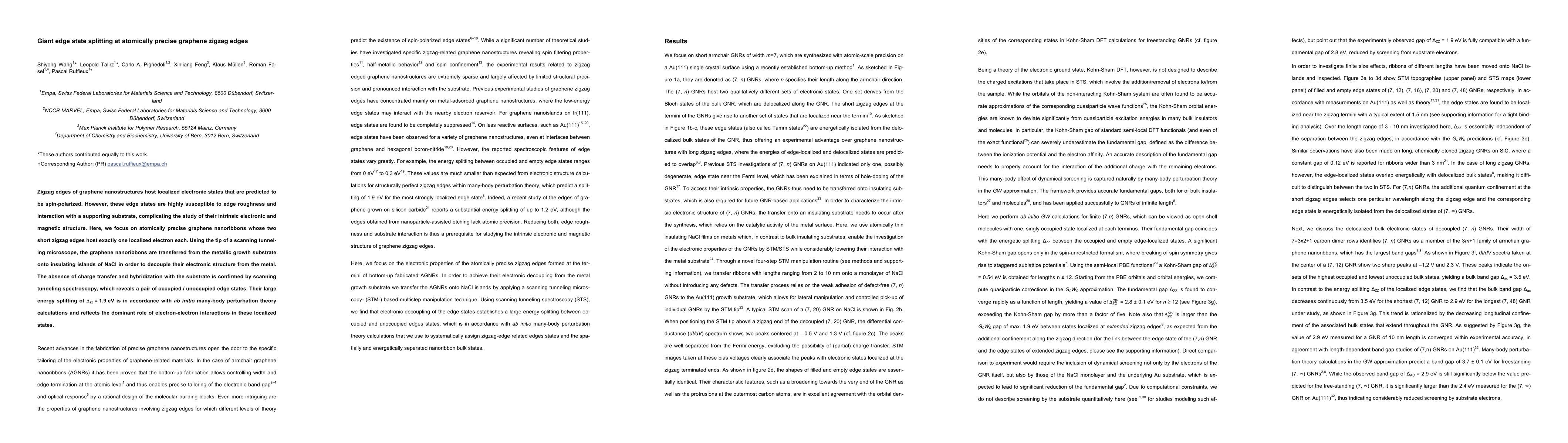 This paper investigates the electronic states at atomically precise zigzag edges of graphene nanoribbons, revealing a significant 1.9 eV energy splitting between occupied and unoccupied edge states, confirmed by scanning tunneling spectroscopy and ab initio calculations, highlighting the influence of electron-electron interactions. The study isolates these states from substrate effects by transferring the nanoribbons onto insulating NaCl islands.