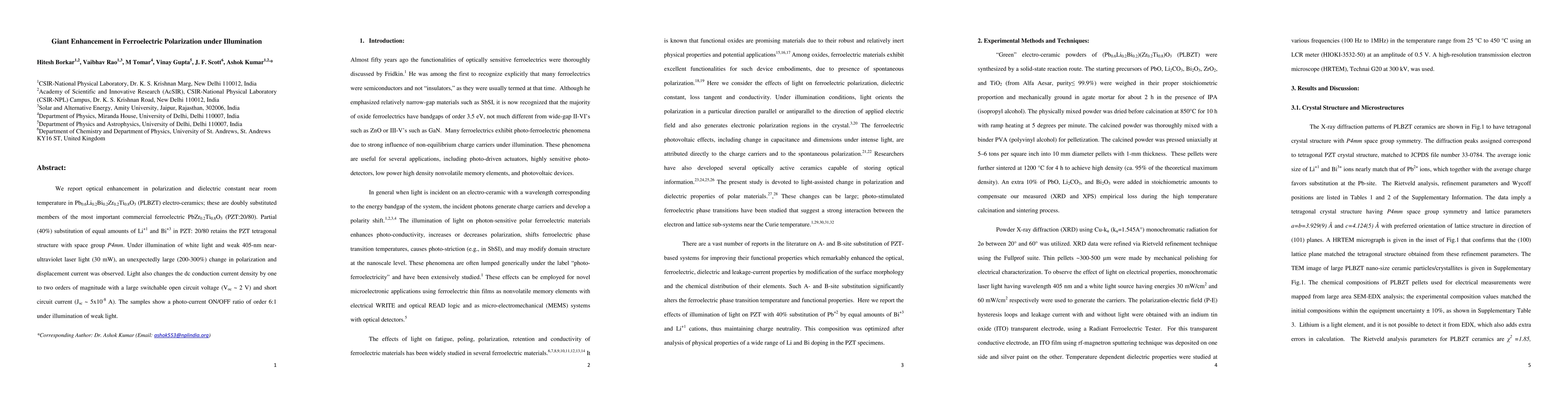 We report optical enhancement in polarization and dielectric constant near room temperature in Pb0.6Li0.2Bi0.2Zr0.2Ti0.8O3 (PLBZT) electro-ceramics; these are doubly substituted members of the most important commercial ferroelectric PbZr0.2Ti0.8O3 (PZT:20/80). Partial (40%) substitution of equal amounts of Li+1 and Bi+3 in PZT: 20/80 retains the PZT tetragonal structure with space group P4mm. Under illumination of white light and weak 405-nm near-ultraviolet laser light (30 mW), an unexpectedly large (200-300%) change in polarization and displacement current was observed. Light also changes the dc conduction current density by one to two orders of magnitude with a large switchable open circuit voltage (Voc ~ 2 V) and short circuit current (Jsc ~ 5x10-8 A). The samples show a photo-current ON/OFF ratio of order 6:1 under illumination of weak light.