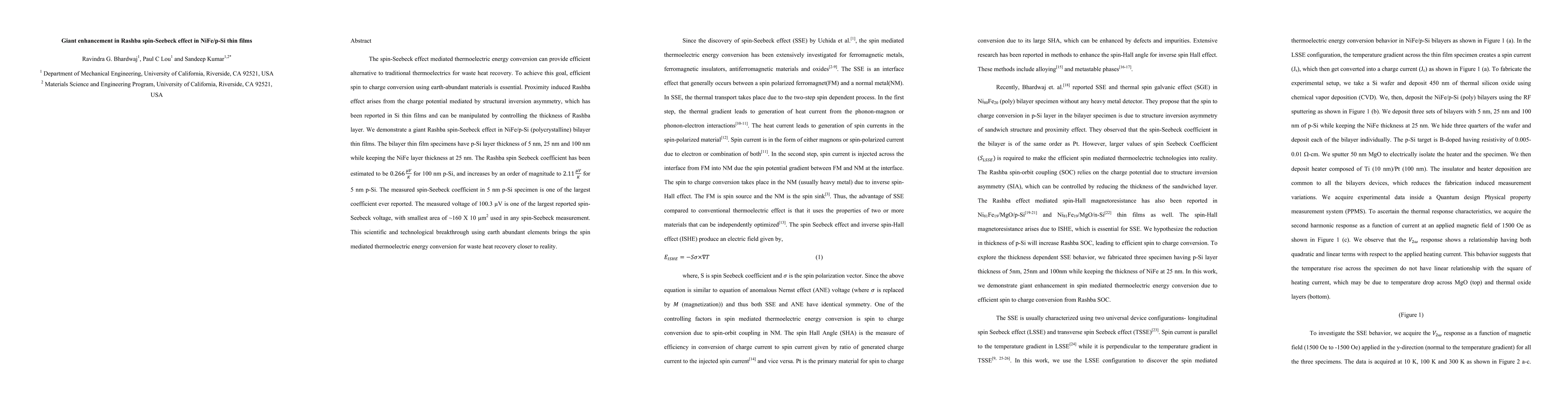 This paper demonstrates a significant enhancement in the Rashba spin-Seebeck effect in NiFe/p-Si thin film bilayers, achieving a spin-Seebeck coefficient of 2.11 μV/K for 5 nm p-Si, marking one of the largest coefficients reported. This breakthrough using abundant materials advances the feasibility of spin-mediated thermoelectric energy conversion for waste heat recovery.