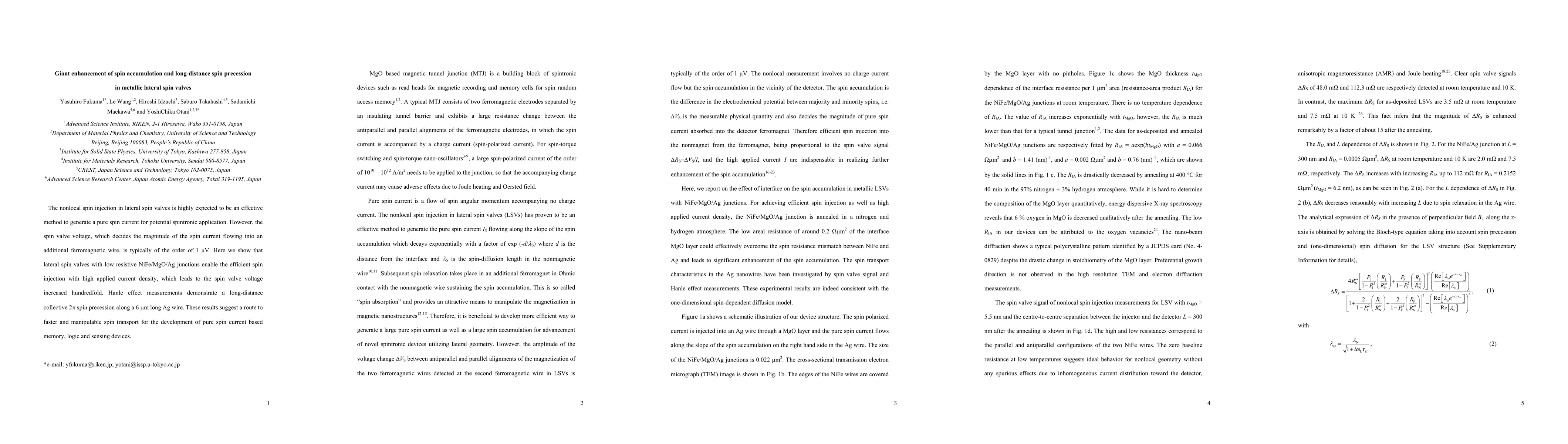 Summary: Researchers demonstrate a significant enhancement in spin accumulation and long-distance spin precession in metallic lateral spin valves through low resistive NiFe/MgO/Ag junctions, achieving a hundredfold increase in spin valve voltage and enabling efficient spin injection. Hanle effect measurements reveal 2-pi spin precession over 6 μm in Ag, suggesting improved prospects for spintronic memory, logic, and sensing devices.