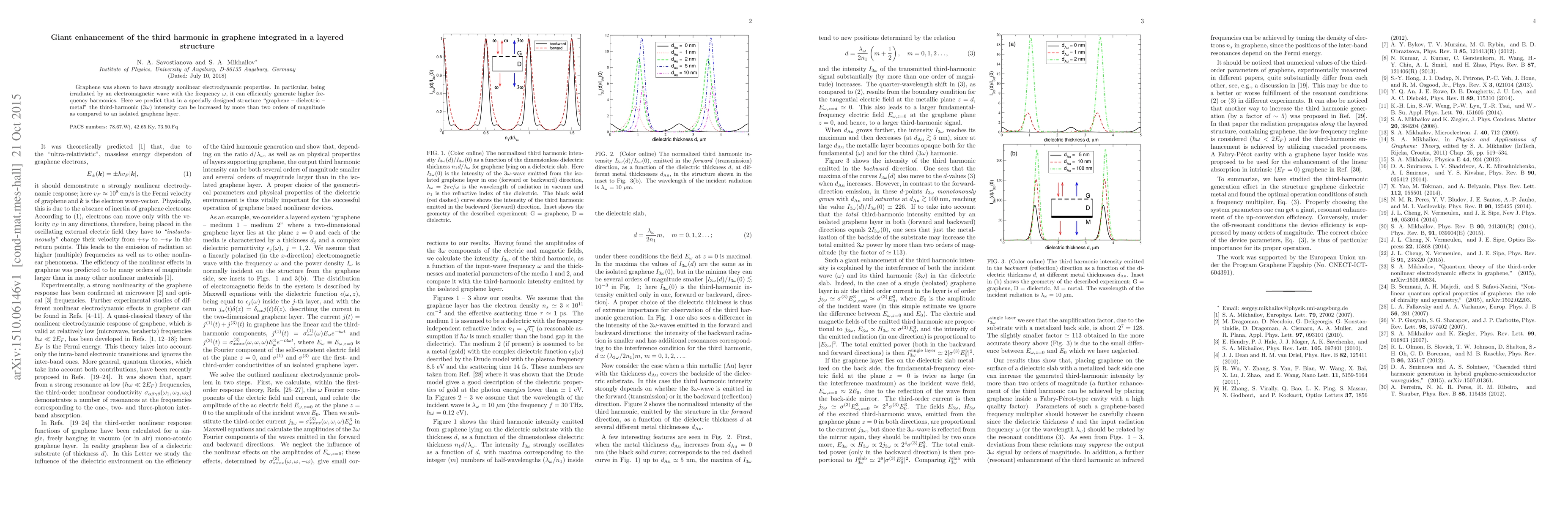 This research predicts a significant enhancement of the third harmonic ($3\omega$) in a layered structure integrating graphene, dielectric, and metal, potentially increasing its intensity by over two orders of magnitude compared to isolated graphene. This finding highlights graphene's strong nonlinear electrodynamic properties.