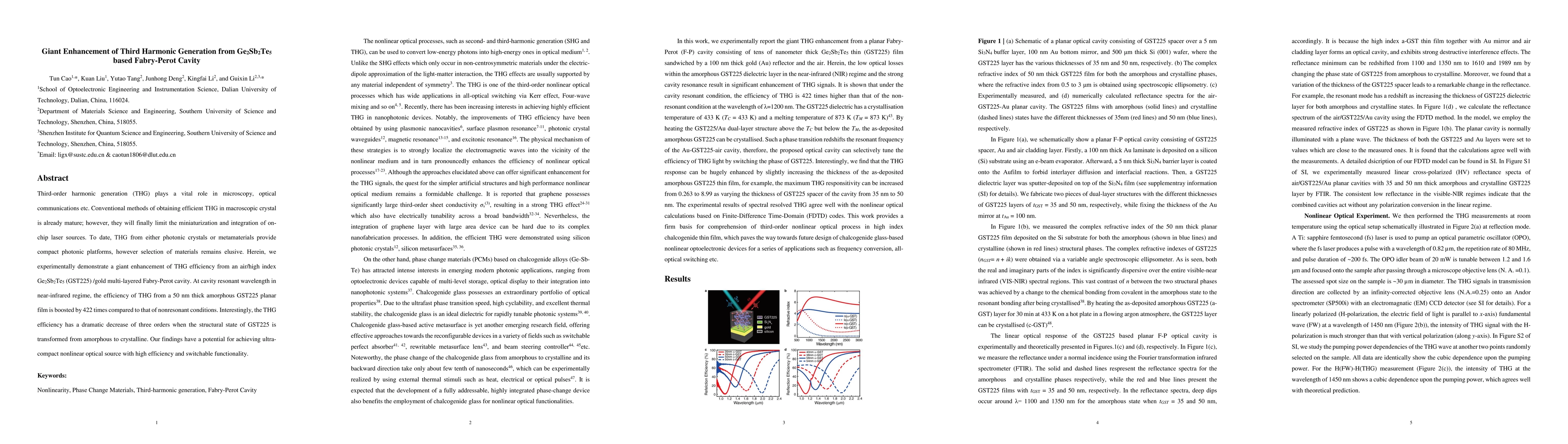 Third-order harmonic generation (THG) plays a vital role in microscopy, optical communications etc. Conventional methods of obtaining efficient THG in macroscopic crystal is already mature; however, they will finally limit the miniaturization and integration of on-chip laser sources. To date, THG from either photonic crystals or metamaterials provide compact photonic platforms, however selection of materials remains elusive. Herein, we experimentally demonstrate a giant enhancement of THG efficiency from an air/high index Ge2Sb2Te5 (GST225) /gold multi-layered Fabry-Perot cavity. At cavity resonant wavelength in near-infrared regime, the efficiency of THG from a 50 nm thick amorphous GST225 planar film is boosted by 422 times compared to that of nonresonant conditions. Interestingly, the THG efficiency has a dramatic decrease of three orders when the structural state of GST225 is transformed from amorphous to crystalline. Our findings have a potential for achieving ultra-compact nonlinear optical source with high efficiency and switchable functionality.
