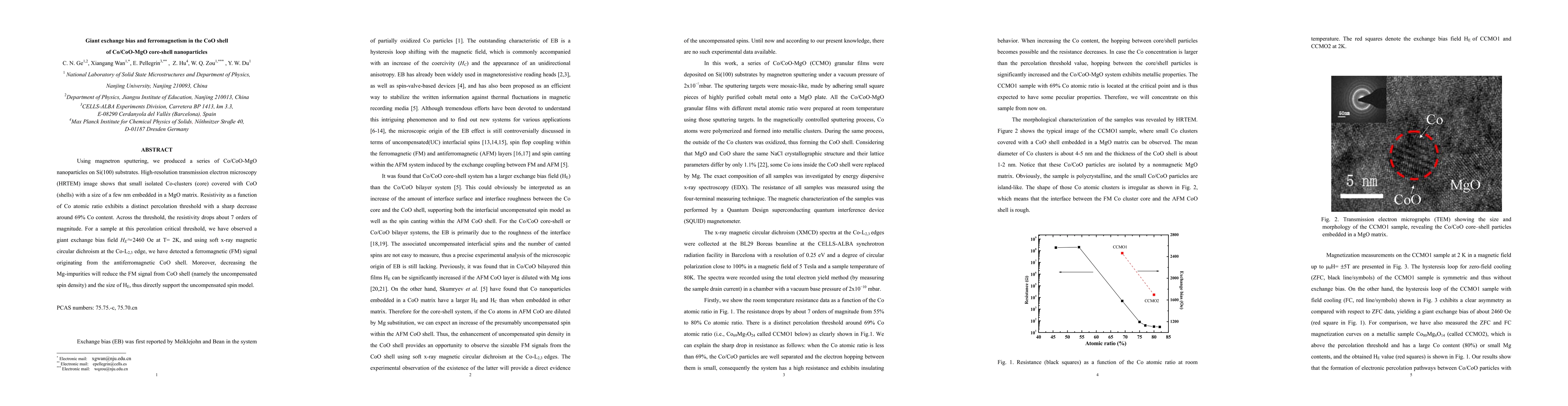 Using magnetron sputtering, we produced a series of Co/CoO-MgO nanoparticles on Si(100) substrates. High-resolution transmission electron microscopy (HRTEM) image shows that small isolated Co-clusters (core) covered with CoO (shells) with a size of a few nm embedded in a MgO matrix. Resistivity as a function of Co atomic ratio exhibits a distinct percolation threshold with a sharp decrease around 69% Co content. Across the threshold, the resistivity drops about 7 orders of magnitude. For a sample at this percolation critical threshold, we have observed a giant exchange bias field HE=2460 Oe at T= 2K, and using soft x-ray magnetic circular dichroism at the Co-L2,3 edge, we have detected a ferromagnetic (FM) signal originating from the antiferromagnetic CoO shell. Moreover, decreasing the Mg-impurities will reduce the FM signal from CoO shell (namely the uncompensated spin density) and the size of HE, thus directly support the uncompensated spin model.