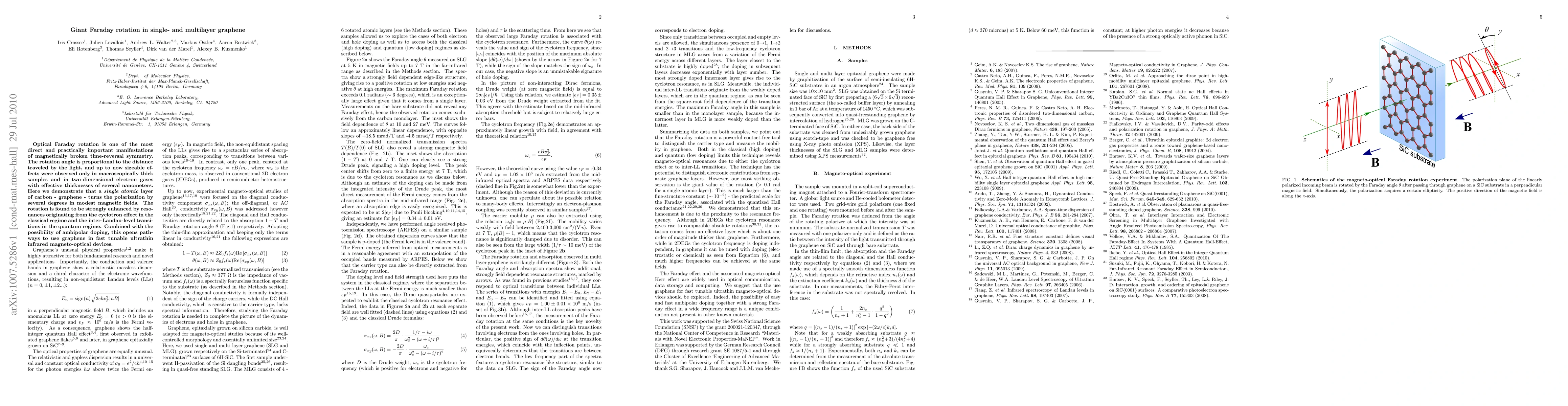 Graphene exhibits giant Faraday rotation in optical wavelengths, demonstrating significant polarization turning in modest magnetic fields due to cyclotron and inter-Landau-level transitions. This property, enhanced by ambipolar doping, suggests potential for tunable ultrathin infrared magneto-optical devices.