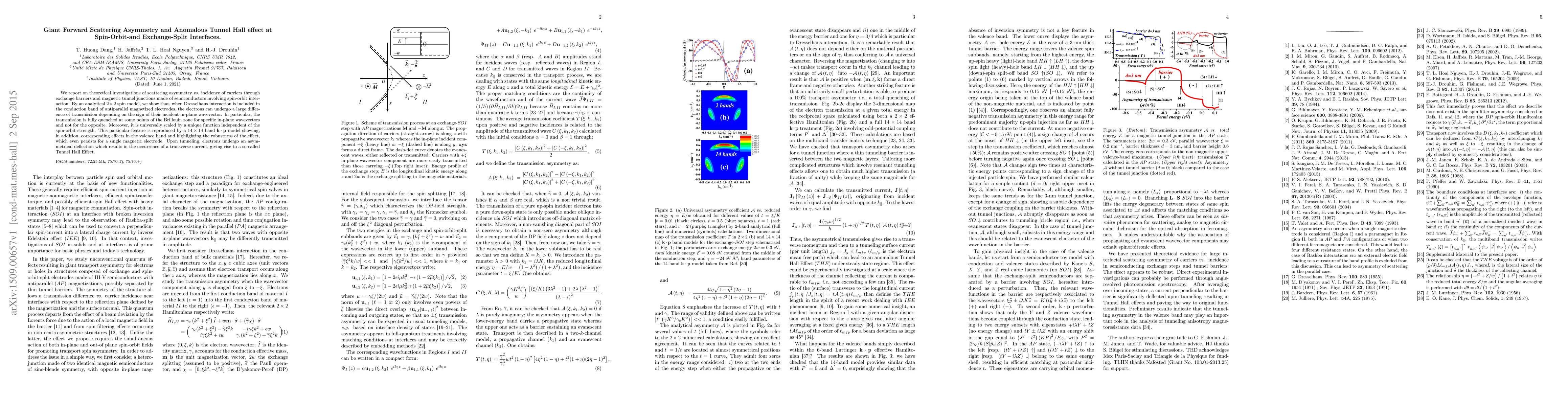 We report on theoretical investigations of scattering asymmetry vs. incidence of carriers through exchange barriers and magnetic tunnel junctions made of semiconductors involving spin-orbit interaction. By an analytical 2?2 spin model, we show that, when Dresselhaus interaction is included in the conduction band of antiparallel magnetized electrodes, the electrons can undergo a large difference of transmission depending on the sign of their incident in-plane wavevector. In particular, the transmission is fully quenched at some points of the Brillouin zone for specific in-plane wavevectors and not for the opposite. Moreover, it is universally scaled by a unique function independent of the spin-orbit strength. This particular feature is reproduced by a 14 ? 14 band k ? p model showing, in addition, corresponding effects in the valence band and highlighting the robustness of the effect, which even persists for a single magnetic electrode. Upon tunneling, electrons undergo an asymmetrical deflection which results in the occurrence of a transverse current, giving rise to a so-called Tunnel Hall Effect.