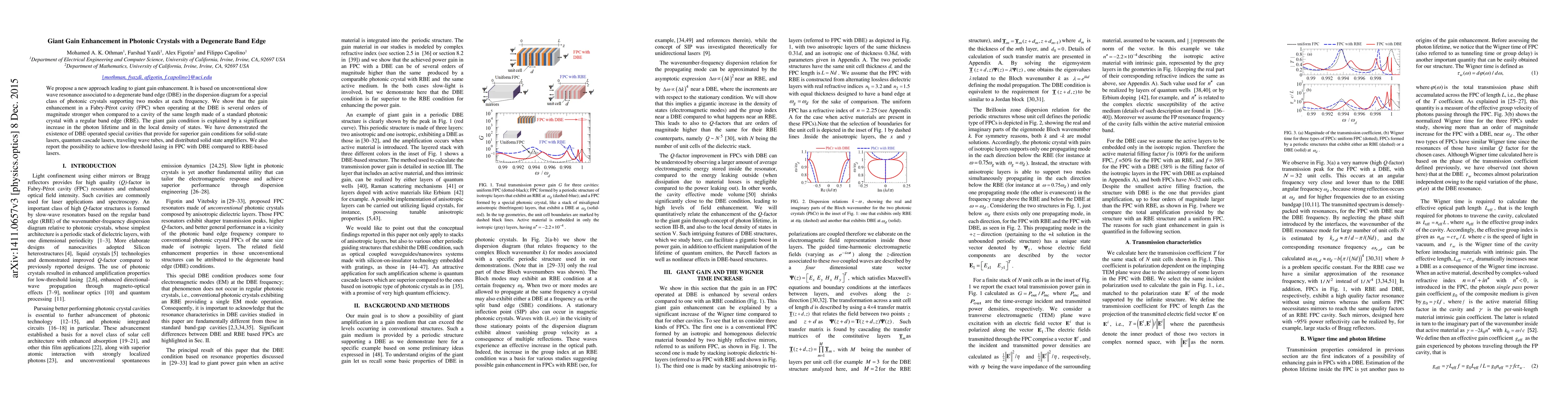 This paper proposes a method for giant gain enhancement in photonic crystals using a degenerate band edge (DBE), which significantly boosts gain in a Fabry-Perot cavity compared to standard photonic crystals. The enhanced gain is attributed to increased photon lifetime and local density of states, enabling superior performance in various laser and amplifier applications.