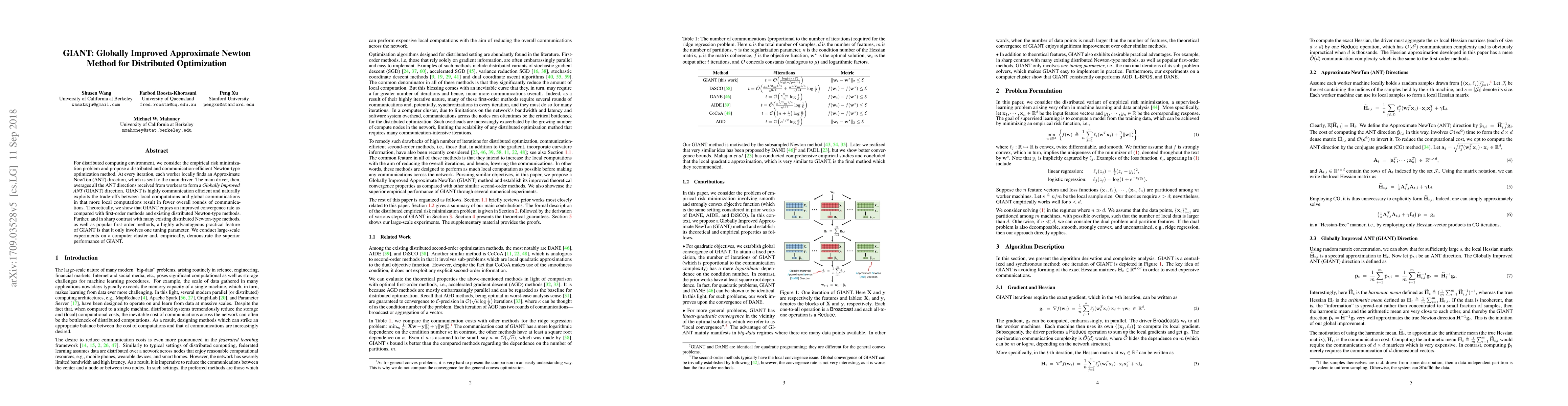 The paper proposes GIANT, a communication-efficient distributed optimization method that leverages locally computed Approximate Newton directions to achieve faster convergence compared to first-order methods. GIANT requires only one tuning parameter and demonstrates superior performance in large-scale experiments.