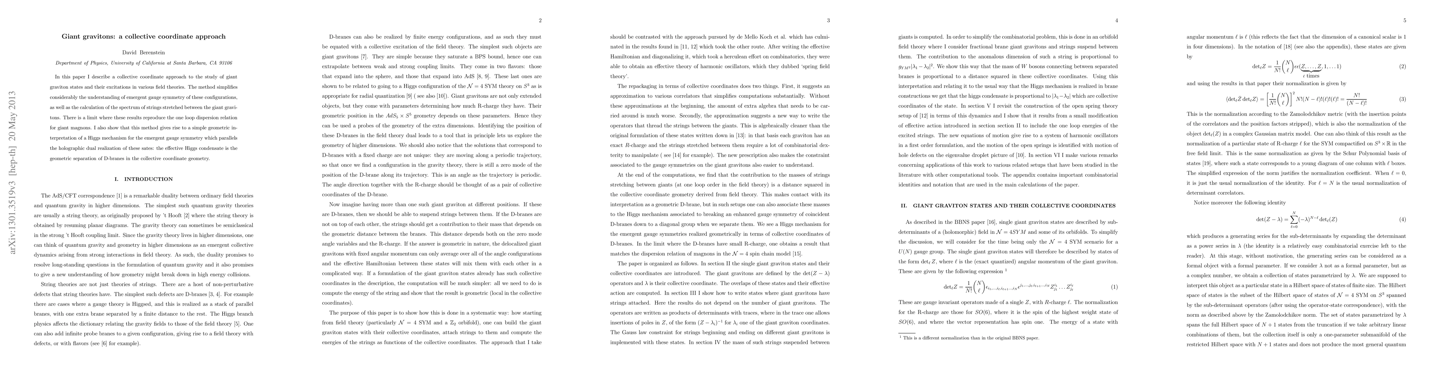 In this paper I describe a collective coordinate approach to the study of giant graviton states and their excitations in various field theories. The method simplifies considerably the understanding of emergent gauge symmetry of these configurations, as well as the calculation of the spectrum of strings stretched between the giant gravitons. There is a limit where these results reproduce the one loop dispersion relation for giant magnons. I also show that this method gives rise to a simple geometric interpretation of a Higgs mechanism for the emergent gauge symmetry which parallels the holographic dual realization of these sates: the effective Higgs condensate is the geometric separation of D-branes in the collective coordinate geometry.