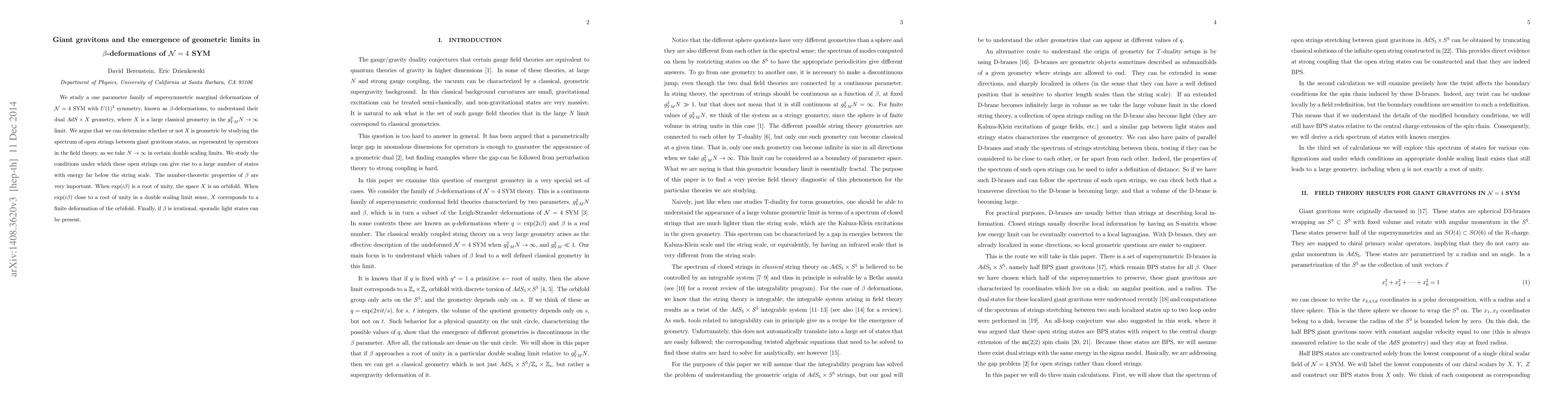 We study a one parameter family of supersymmetric marginal deformations of ${\cal N}=4$ SYM with $U(1)^3$ symmetry, known as $\beta$-deformations, to understand their dual $AdS\times X$ geometry, where $X$ is a large classical geometry in the $g_{YM}^2N\to \infty$ limit. We argue that we can determine whether or not $X$ is geometric by studying the spectrum of open strings between giant gravitons states, as represented by operators in the field theory, as we take $N\to\infty$ in certain double scaling limits. We study the conditions under which these open strings can give rise to a large number of states with energy far below the string scale. The number-theoretic properties of $\beta$ are very important. When $\exp(i\beta)$ is a root of unity, the space $X$ is an orbifold. When $\exp(i\beta)$ close to a root of unity in a double scaling limit sense, $X$ corresponds to a finite deformation of the orbifold. Finally, if $\beta$ is irrational, sporadic light states can be present.