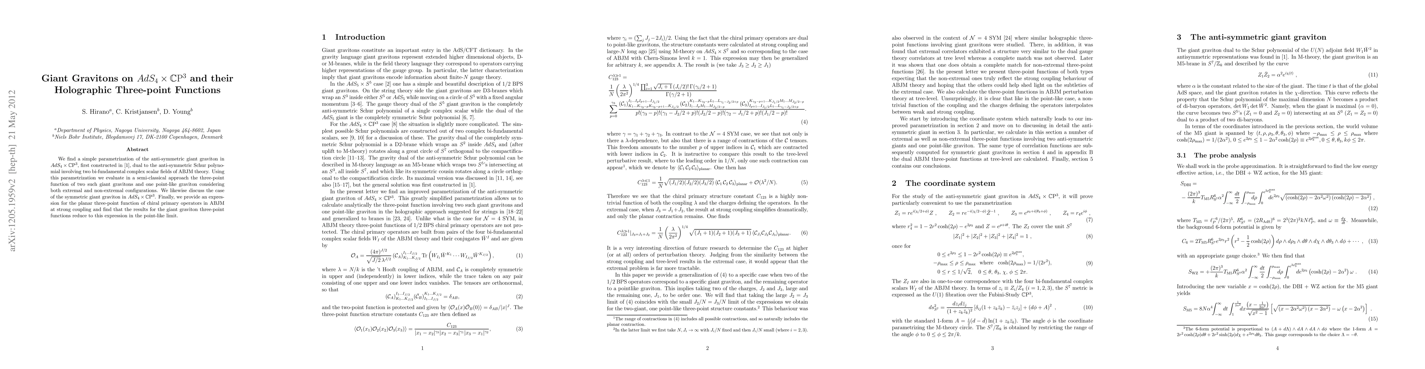 We find a simple parametrization of the anti-symmetric giant graviton in AdS_4 x CP^3, first constructed in arXiv:1108.3084 [hep-th], dual to the anti-symmetric Schur polynomial involving two bi-fundamental complex scalar fields of ABJM theory. Using this parametrization we evaluate in a semi-classical approach the three-point function of two such giant gravitons and one point-like graviton considering both extremal and non-extremal configurations. We likewise discuss the case of the symmetric giant graviton in AdS_4 x CP^3. Finally, we provide an expression for the planar three-point function of chiral primary operators in ABJM at strong coupling and find that the results for the giant graviton three-point functions reduce to this expression in the point-like limit.