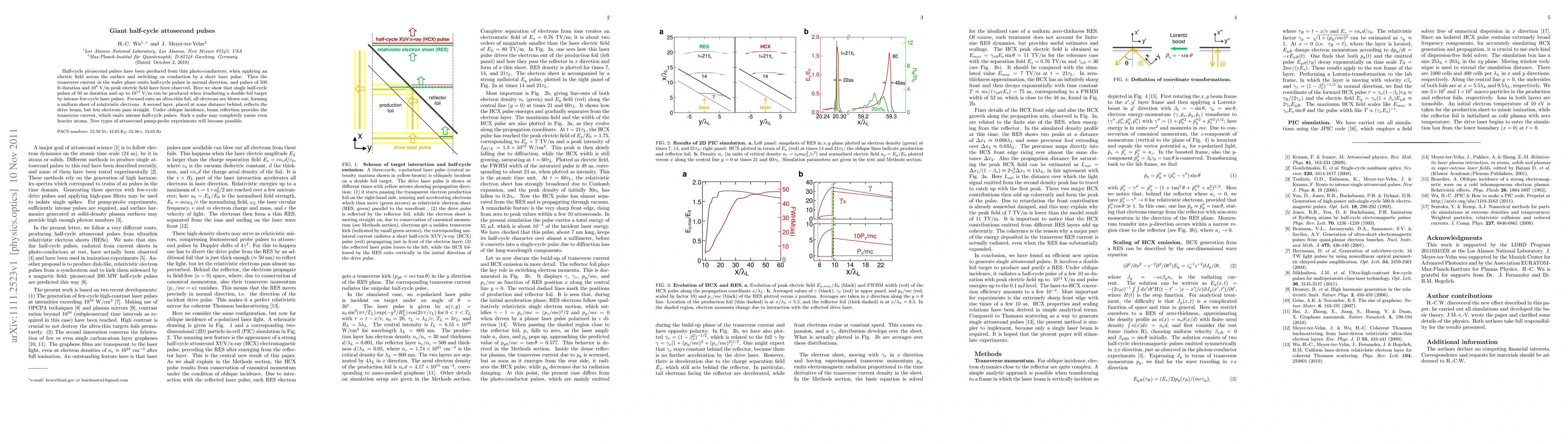 Half-cycle picosecond pulses have been produced from thin photo-conductors, when applying an electric field across the surface and switching on conduction by a short laser pulse. Then the transverse current in the wafer plane emits half-cycle pulses in normal direction, and pulses of 500 fs duration and 1e6 V/m peak electric field have been observed. Here we show that single half-cycle pulses of 50 as duration and up to 1e13 V/m can be produced when irradiating a double foil target by intense few-cycle laser pulses. Focused onto an ultra-thin foil, all electrons are blown out, forming a uniform sheet of relativistic electrons. A second layer, placed at some distance behind, reflects the drive beam, but lets electrons pass straight. Under oblique incidence, beam reflection provides the transverse current, which emits intense half-cycle pulses. Such a pulse may completely ionize even heavier atoms. New types of attosecond pump-probe experiments will become possible.