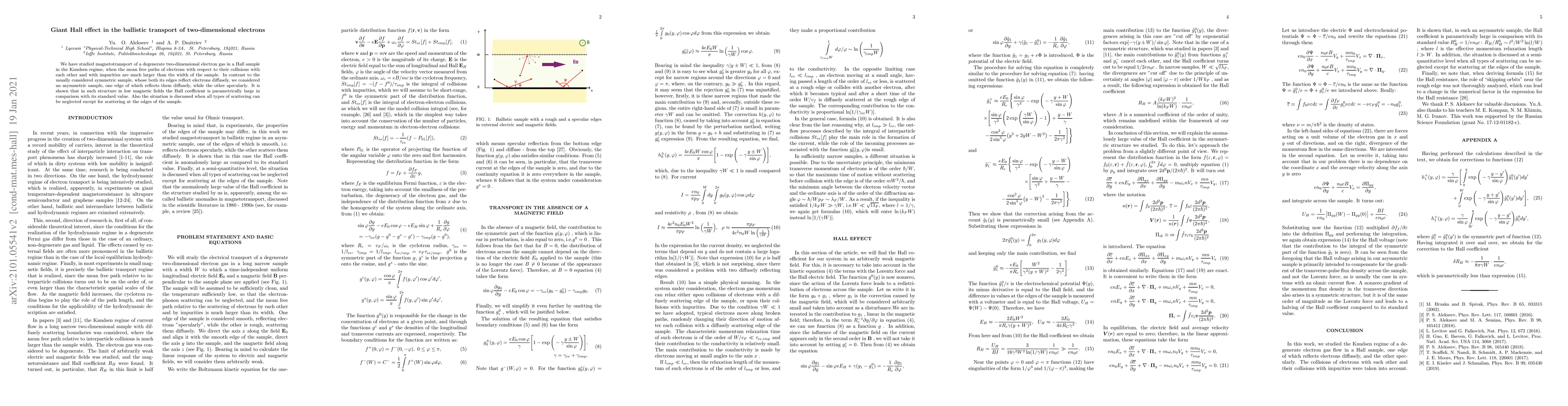 We have studied magnetotransport of a degenerate two-dimensional electron gas in a Hall sample in the Knudsen regime, when the mean free paths of electrons with respect to their collisions with each other and with impurities are much larger than the width of the sample. In contrast to the usually considered symmetric sample, whose both its edges reflect electrons diffusely, we considered an asymmetric sample, one edge of which reflects them diffusely, while the other specularly. It is shown that in such structure in low magnetic fields the Hall coefficient is parametrically large in comparison with its standard value. Also the situation is discussed when all types of scattering can be neglected except for scattering at the edges of the sample.