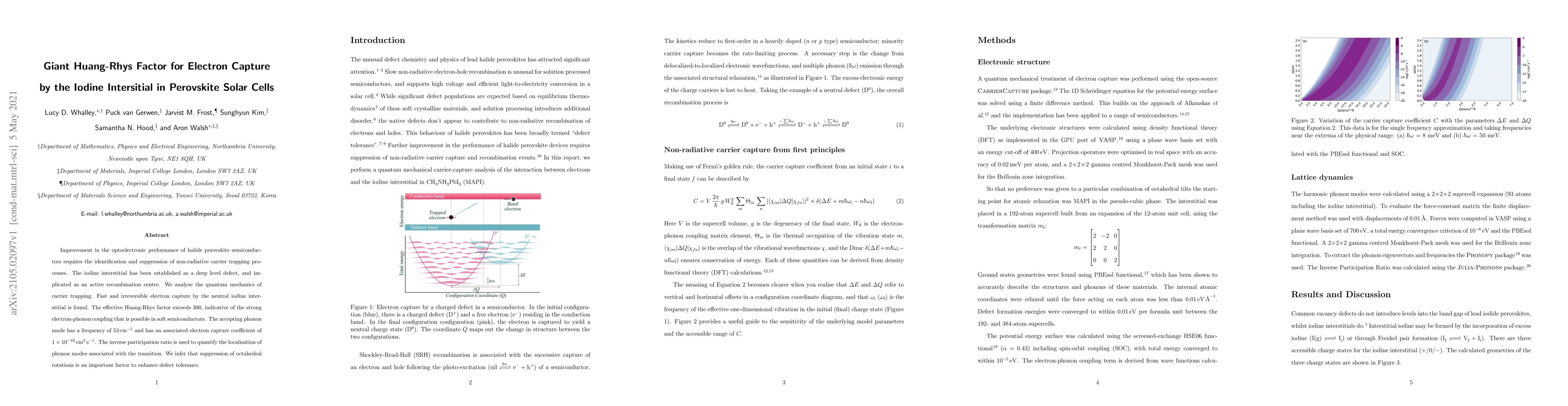 This paper investigates the electron capture by iodine interstitials in perovskite solar cells, revealing a giant Huang-Rhys factor of over 300 due to strong electron-phonon coupling. The study suggests that suppressing octahedral rotations could enhance defect tolerance and improve optoelectronic performance.
