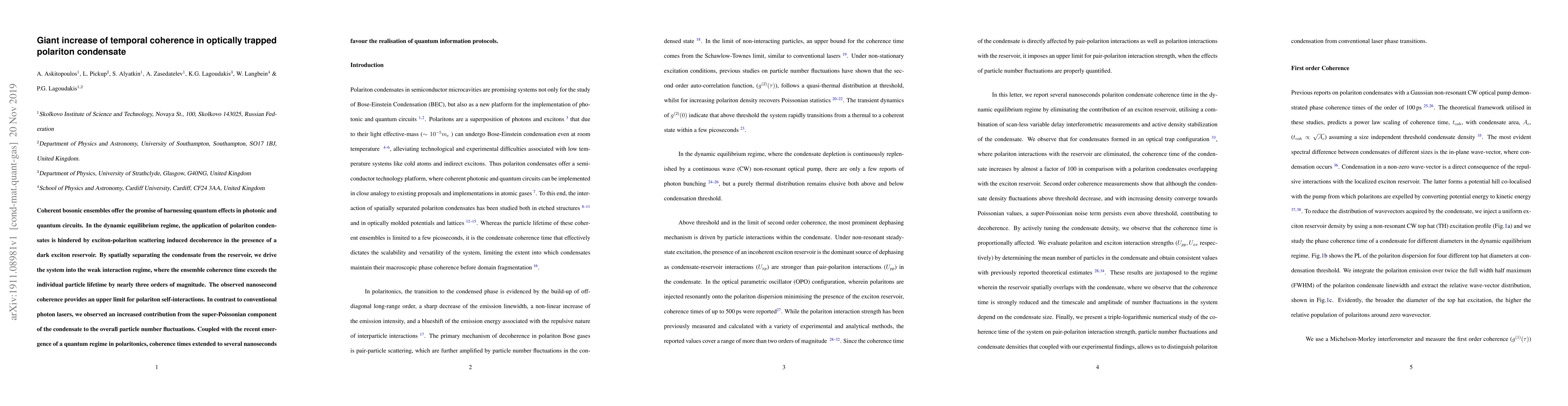 This research demonstrates a significant increase in temporal coherence in optically trapped polariton condensates by spatially separating the condensate from a dark exciton reservoir, achieving coherence times over three orders of magnitude longer than individual particle lifetimes. This extended coherence supports the potential for quantum information protocols in polaritonic systems.