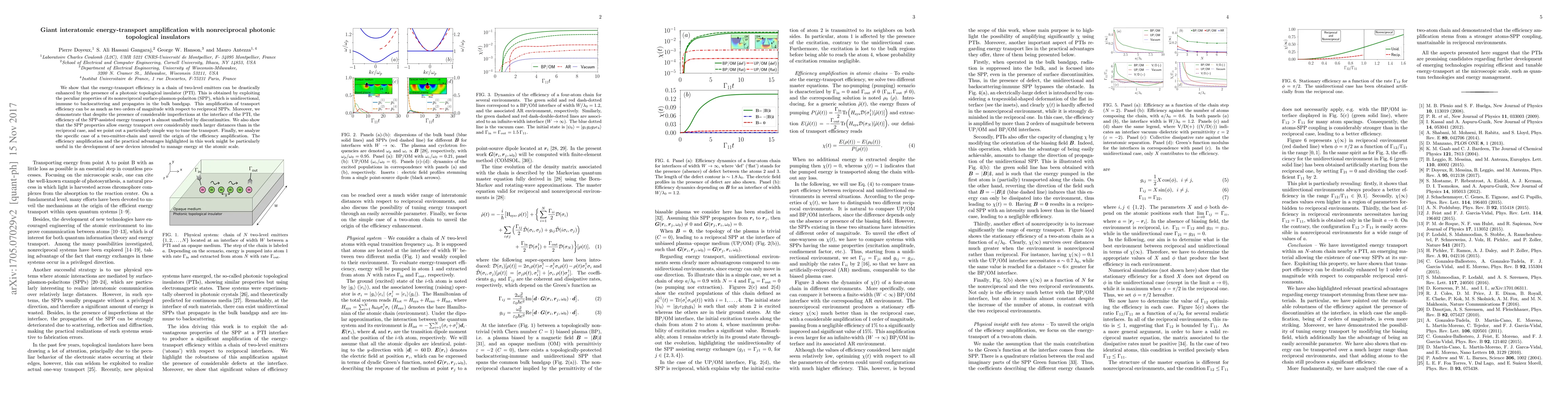 We show that the energy-transport efficiency in a chain of two-level emitters can be drastically enhanced by the presence of a photonic topological insulator (PTI). This is obtained by exploiting the peculiar properties of its nonreciprocal surface plasmon polariton (SPP), which is unidirectional, and immune to backscattering, and propagates in the bulk band gap. This amplification of transport efficiency can be as much as 2 orders of magnitude with respect to reciprocal SPPs. Moreover, we demonstrate that despite the presence of considerable imperfections at the interface of the PTI, the efficiency of the SPP-assisted energy transport is almost unaffected by discontinuities. We also show that the SPP properties allow energy transport over considerably much larger distances than in the reciprocal case, and we point out a particularly simple way to tune the transport. Finally, we analyze the specific case of a two-emitter chain and unveil the origin of the efficiency amplification. The efficiency amplification and the practical advantages highlighted in this work might be particularly useful in the development of new devices intended to manage energy at the atomic scale.