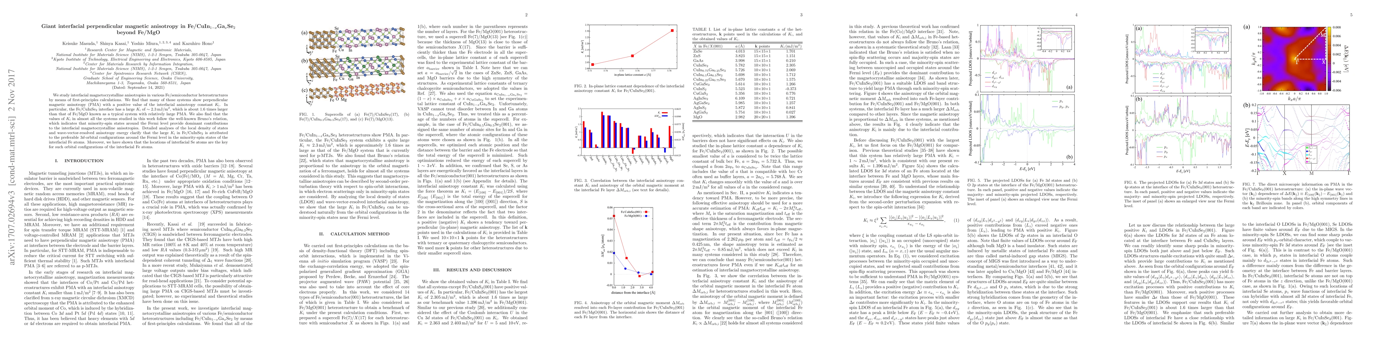 We study interfacial magnetocrystalline anisotropies in various Fe/semiconductor heterostructures by means of first-principles calculations. We find that many of those systems show perpendicular magnetic anisotropy (PMA) with a positive value of the interfacial anisotropy constant $K_{\rm i}$. In particular, the Fe/CuInSe$_2$ interface has a large $K_{\rm i}$ of $\sim 2.3\,{\rm mJ/m^2}$, which is about 1.6 times larger than that of Fe/MgO known as a typical system with relatively large PMA. We also find that the values of $K_{\rm i}$ in almost all the systems studied in this work follow the well-known Bruno's relation, which indicates that minority-spin states around the Fermi level provide dominant contributions to the interfacial magnetocrystalline anisotropies. Detailed analyses of the local density of states and wave-vector-resolved anisotropy energy clarify that the large $K_{\rm i}$ in Fe/CuInSe$_2$ is attributed to the preferable $3d$-orbital configurations around the Fermi level in the minority-spin states of the interfacial Fe atoms. Moreover, we have shown that the locations of interfacial Se atoms are the key for such orbital configurations of the interfacial Fe atoms.