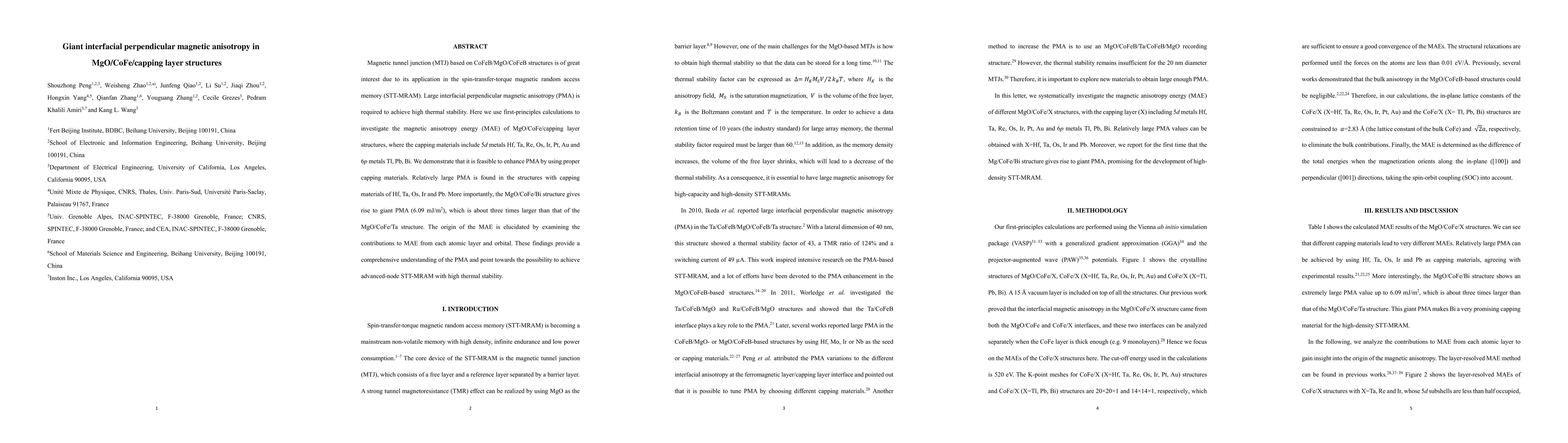 This study investigates the magnetic anisotropy energy (MAE) in MgO/CoFe/capping layer structures using first-principles calculations. The MgO/CoFe/Bi structure exhibits a giant interfacial perpendicular magnetic anisotropy (PMA) of 6.09 mJ/m², significantly enhancing the potential for advanced-node STT-MRAM with high thermal stability.