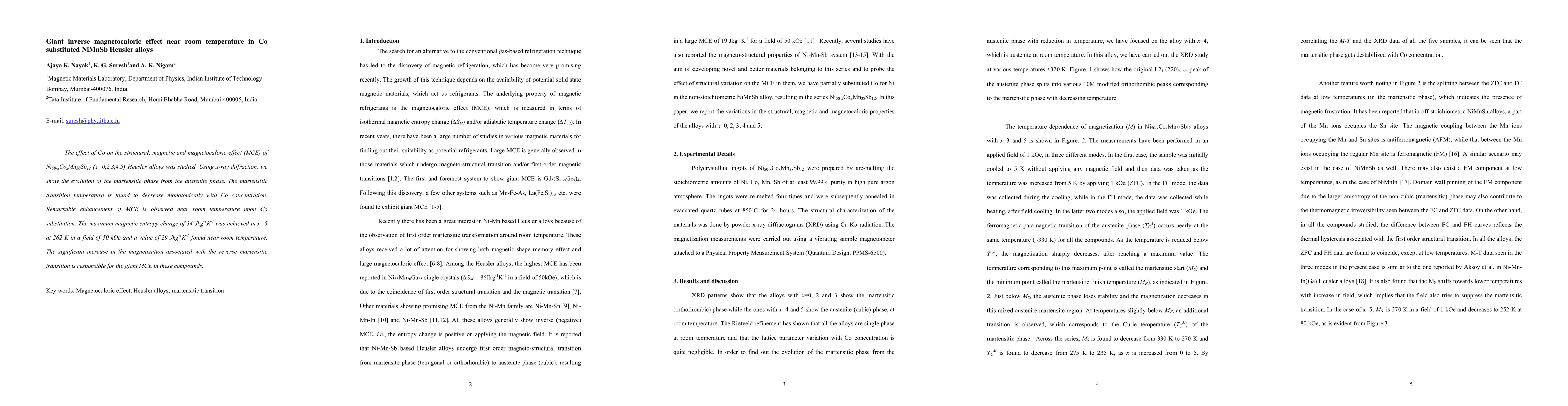 This study investigates the impact of Co substitution on NiMnSb Heusler alloys, revealing a significant enhancement in magnetocaloric effect (MCE) near room temperature. The maximum magnetic entropy change of 34 Jkg⁻¹K⁻¹ was achieved at higher Co concentrations, driven by a notable increase in magnetization during the reverse martensitic transition.