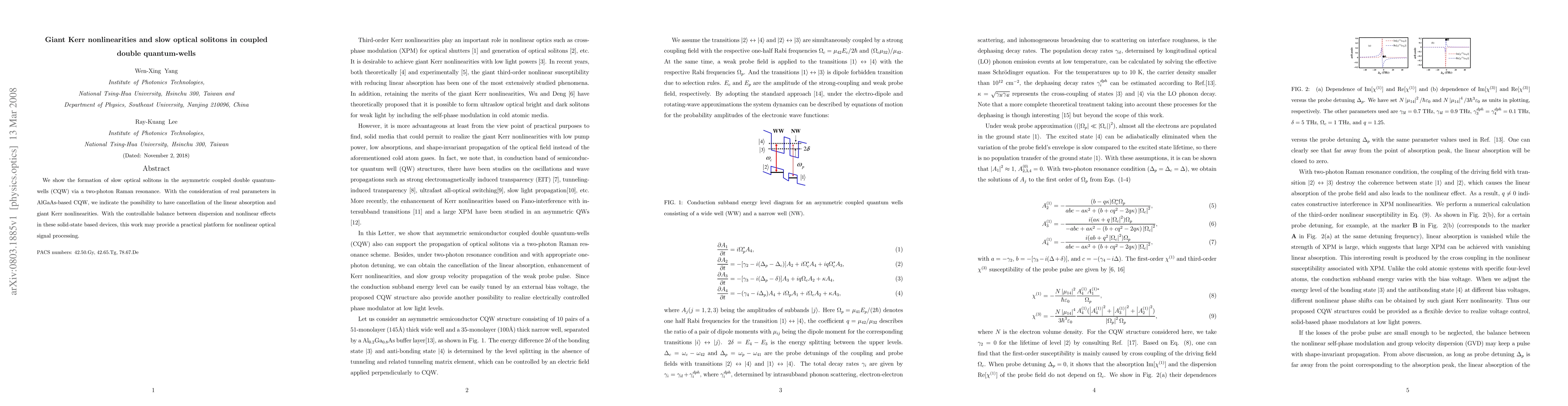 This paper demonstrates the formation of slow optical solitons in asymmetric coupled double quantum-wells through a two-photon Raman resonance, highlighting the potential for cancellation of linear absorption and giant Kerr nonlinearities in AlGaAs-based structures. The balance between dispersion and nonlinear effects in these devices offers a practical platform for nonlinear optical signal processing.