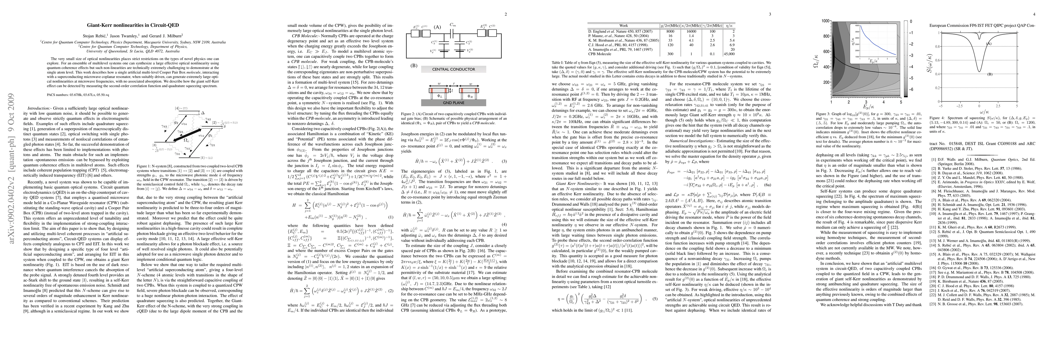This paper demonstrates the generation of large optical nonlinearities at microwave frequencies using a single artificial multi-level Cooper Pair Box molecule in a superconducting microwave resonator, achieving the giant self-Kerr effect without absorption. The effect is detected via second-order correlation function and quadrature squeezing spectrum.