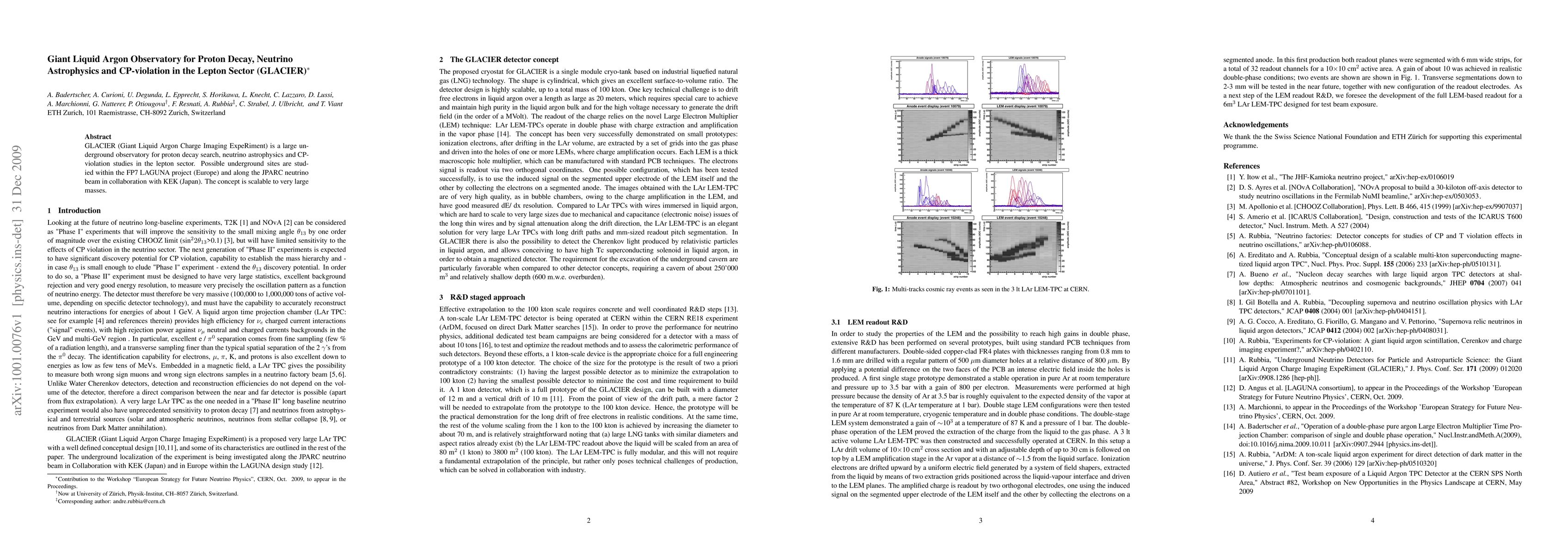 The GLACIER project is a large underground observatory for detecting proton decay, studying neutrino astrophysics, and searching for CP-violation in the lepton sector. The concept is scalable to very large masses, with possible locations identified in Europe and Japan.