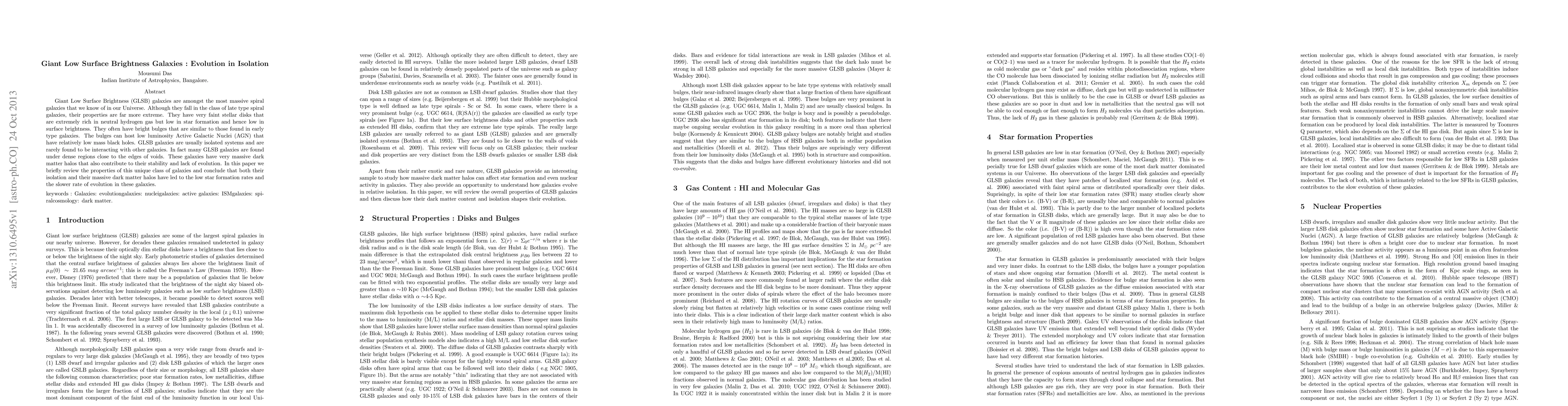This paper reviews Giant Low Surface Brightness (GLSB) galaxies, noting their extreme properties, including faint stellar disks rich in neutral hydrogen but low in star formation, and bright bulges similar to early type galaxies. The study concludes that their isolation and massive dark matter halos contribute to their low star formation rates and slower evolution.