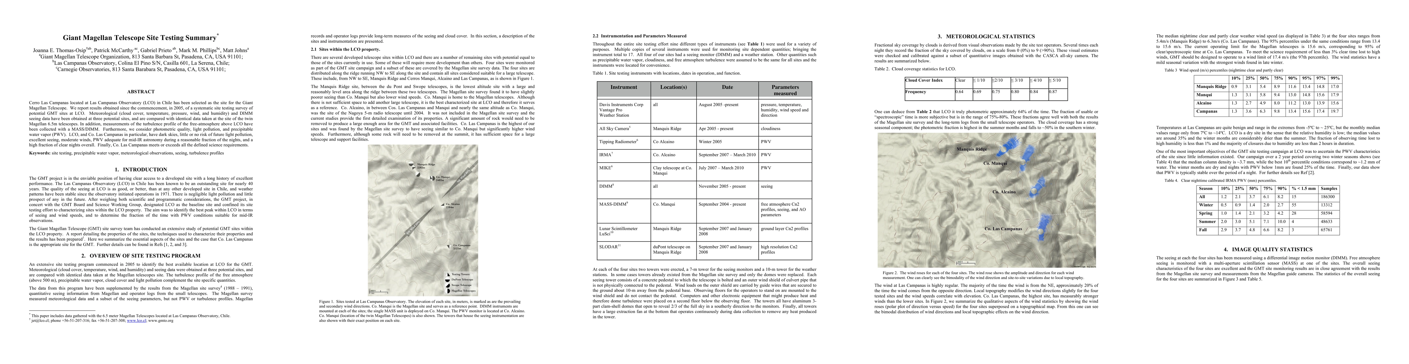 Cerro Las Campanas at Las Campanas Observatory in Chile has been chosen as the optimal site for the Giant Magellan Telescope, meeting all defined science requirements based on comprehensive site testing since 2005, including atmospheric conditions, light pollution, and photometric quality. The site offers excellent seeing, minimal light pollution, and a high fraction of clear nights.