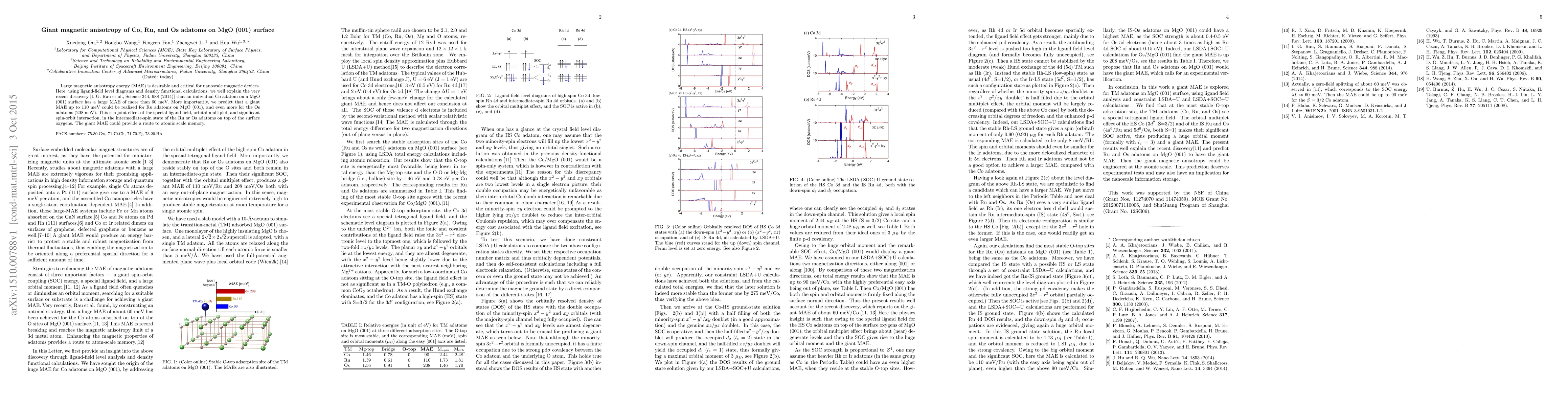This paper explains the large magnetic anisotropy energy (MAE) of Co, Ru, and Os adatoms on MgO (001) surfaces, predicting a giant MAE up to 208 meV for Os adatoms due to ligand-field effects and spin-orbit interactions, potentially enabling atomic scale memory devices.