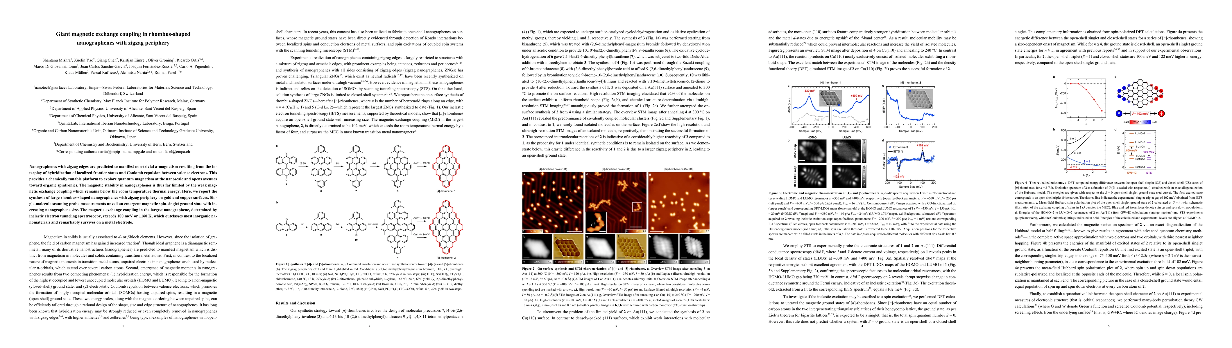 This paper reports the synthesis of large rhombus-shaped nanographenes with zigzag edges, revealing a giant magnetic exchange coupling exceeding 100 meV (1160 K) in the largest nanographene, significantly surpassing room temperature thermal energy and demonstrating potential for organic spintronics.