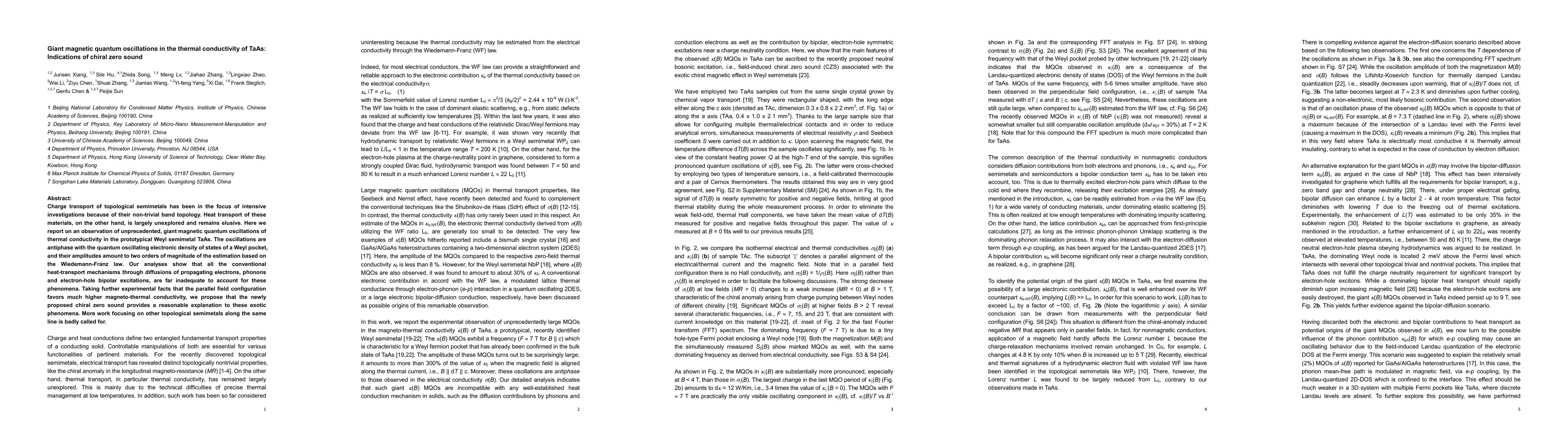 This paper reports on giant magnetic quantum oscillations in the thermal conductivity of TaAs, a Weyl semimetal, which are not explained by conventional heat-transport mechanisms. The authors propose that chiral zero sound may be responsible for these exotic thermal conductivity phenomena.