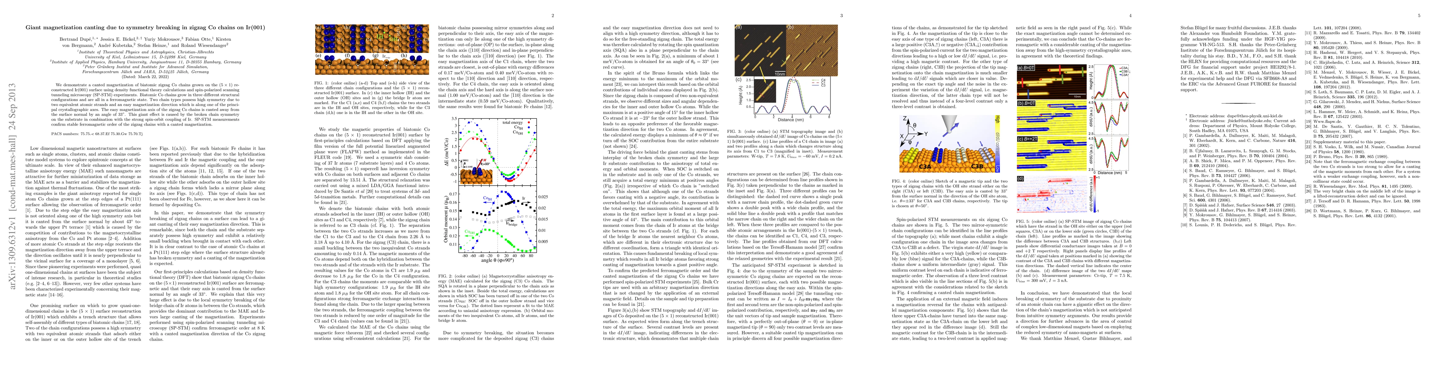 We demonstrate a canted magnetization of biatomic zigzag Co chains grown on the 5 x 1 reconstructed Ir(001) surface using density functional theory calculations and spin-polarized scanning tunneling microscopy (SP-STM) experiments. Biatomic Co chains grow in three different structural configurations and are all in a ferromagnetic state. Two chain types possess high symmetry due to two equivalent atomic strands and an easy magnetization direction which is along one of the principal crystallographic axes. The easy magnetization axis of the zigzag Co chains is canted away from the surface normal by an angle of 33 degrees. This giant effect is caused by the broken chain symmetry on the substrate in combination with the strong spin-orbit coupling of Ir. SP-STM measurements confirm stable ferromagnetic order of the zigzag chains with a canted magnetization.