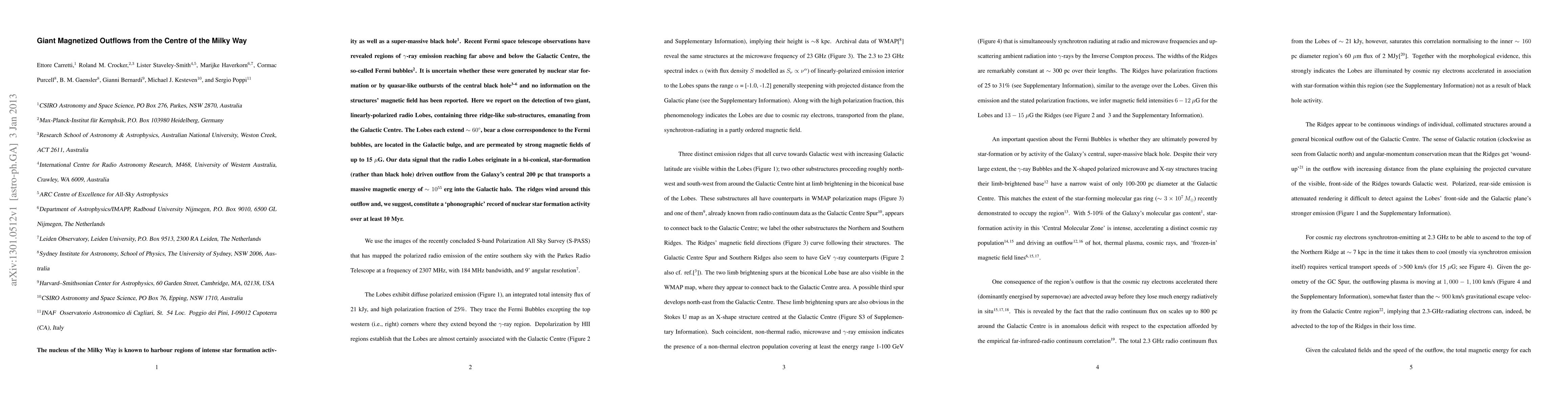The nucleus of the Milky Way is known to harbour regions of intense star formation activity as well as a super-massive black hole. Recent Fermi space telescope observations have revealed regions of \gamma-ray emission reaching far above and below the Galactic Centre, the so-called Fermi bubbles. It is uncertain whether these were generated by nuclear star formation or by quasar-like outbursts of the central black hole and no information on the structures' magnetic field has been reported. Here we report on the detection of two giant, linearly-polarized radio Lobes, containing three ridge-like sub-structures, emanating from the Galactic Centre. The Lobes each extend ~60 deg, bear a close correspondence to the Fermi bubbles, are located in the Galactic bulge, and are permeated by strong magnetic fields of up to 15 \mu G. Our data signal that the radio Lobes originate in a bi-conical, star-formation (rather than black hole) driven outflow from the Galaxy's central 200 pc that transports a massive magnetic energy of ~10^55 erg into the Galactic halo. The ridges wind around this outflow and, we suggest, constitute a `phonographic' record of nuclear star formation activity over at least 10 Myr.