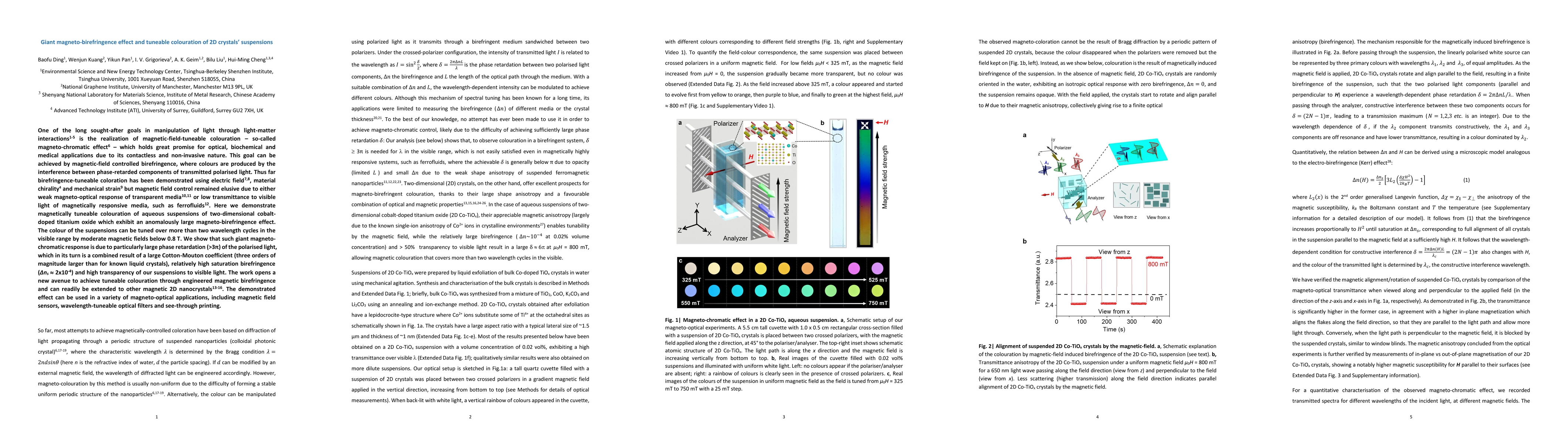 This paper demonstrates magnetically tuneable colouration in suspensions of two-dimensional cobalt-doped titanium oxide crystals, showing a giant magneto-birefringence effect that enables tuning over two wavelength cycles in the visible range. The large phase retardation and high transparency to visible light enable contactless, non-invasive optical applications.