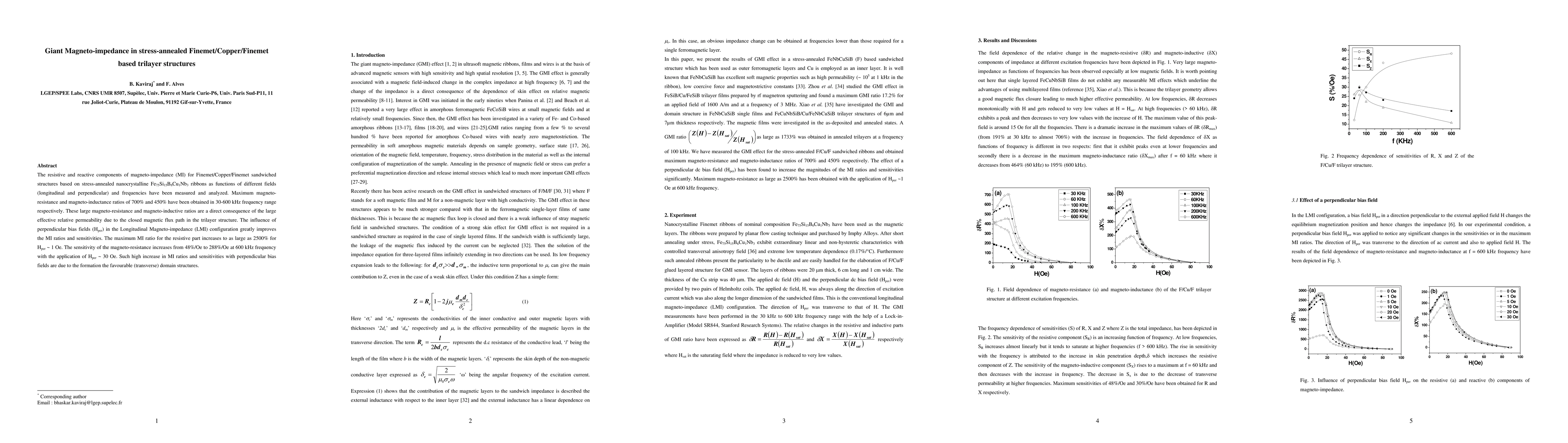 This study investigates the magneto-impedance in trilayer structures composed of stress-annealed Finemet/Copper/Finemet ribbons, revealing maximum magneto-resistance and magneto-inductance ratios of 700% and 450% respectively. The application of perpendicular bias fields significantly enhances these ratios, achieving up to 2500% and increasing sensitivity from 48%/Oe to 288%/Oe at 600 kHz.