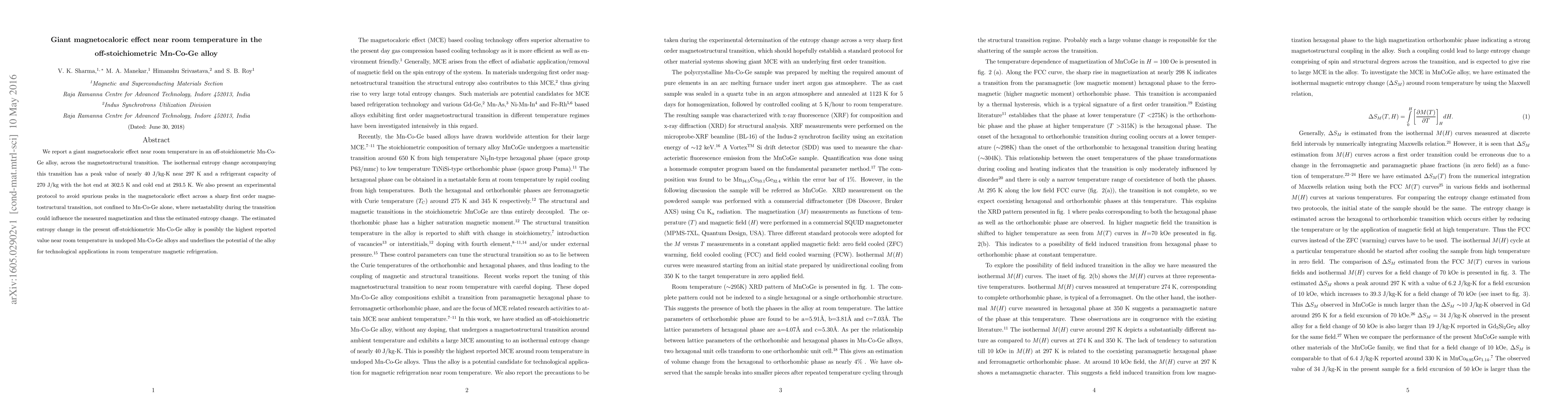 This paper reports a significant magnetocaloric effect near room temperature in an off-stoichiometric Mn-Co-Ge alloy, with a peak isothermal entropy change of nearly 40 J/kg-K. The study also outlines a protocol to accurately measure the magnetocaloric effect, highlighting the alloy's potential for magnetic refrigeration applications.