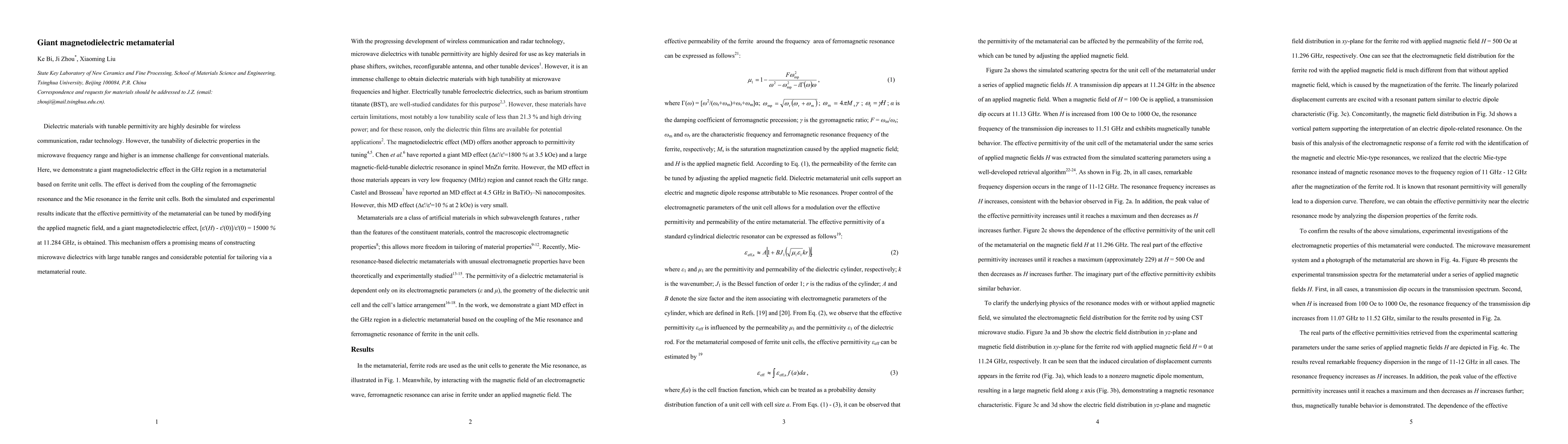 Dielectric materials with tunable permittivity are highly desirable for wireless communication, radar technology. However, the tunability of dielectric properties in the microwave frequency range and higher is an immense challenge for conventional materials. Here, we demonstrate a giant magnetodielectric effect in the GHz region in a metamaterial based on ferrite unit cells. The effect is derived from the coupling of the ferromagnetic resonance and the Mie resonance in the ferrite unit cells. Both the simulated and experimental results indicate that the effective permittivity of the metamaterial can be tuned by modifying the applied magnetic field, and a giant magnetodielectric effect, [{\epsilon}'(H) - {\epsilon}'(0)]/{\epsilon}'(0) = 15000 % at 11.284 GHz, is obtained. This mechanism offers a promising means of constructing microwave dielectrics with large tunable ranges and considerable potential for tailoring via a metamaterial route.